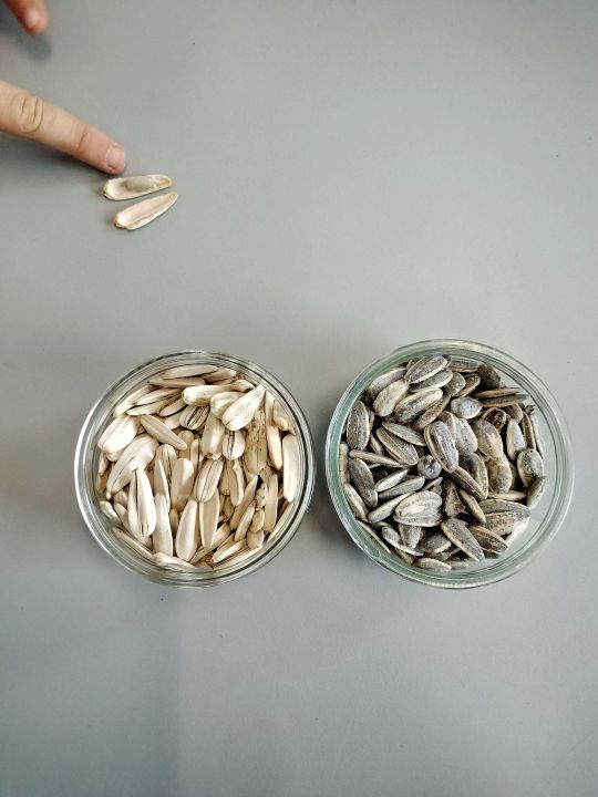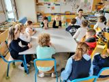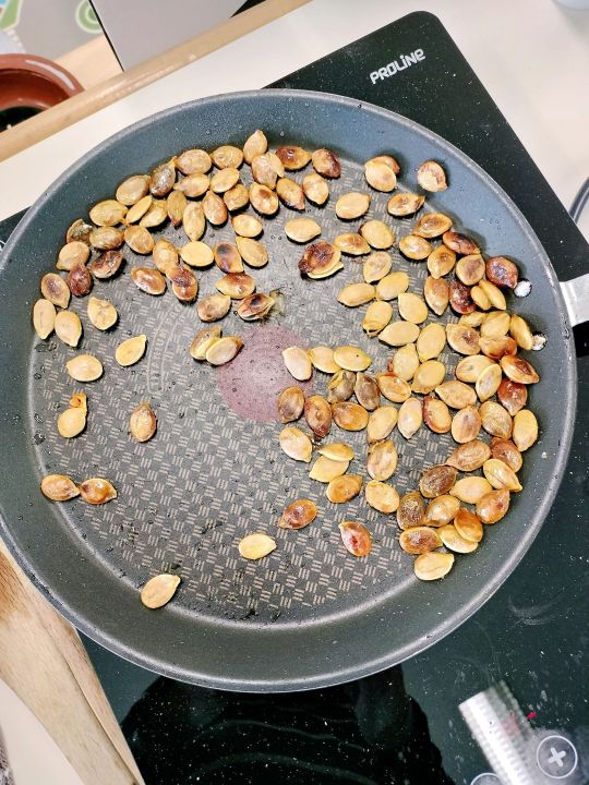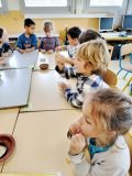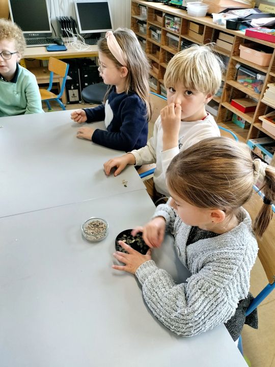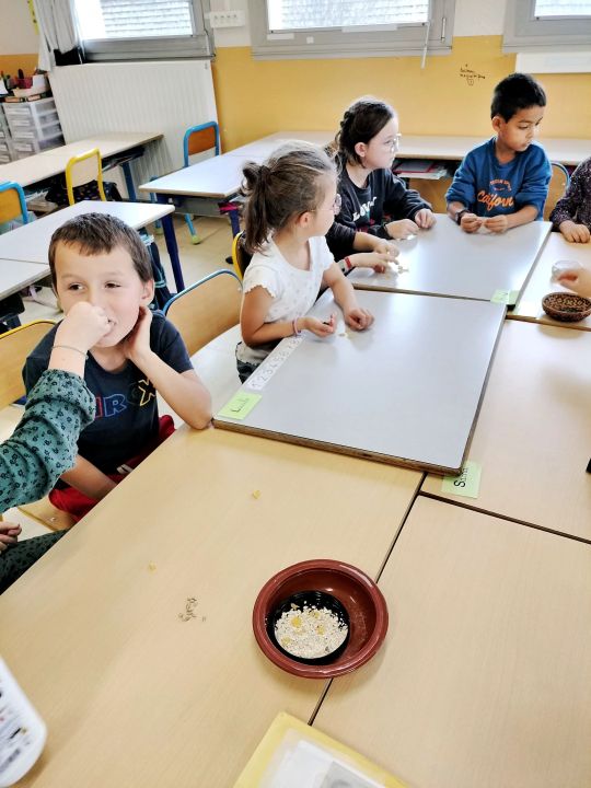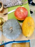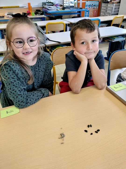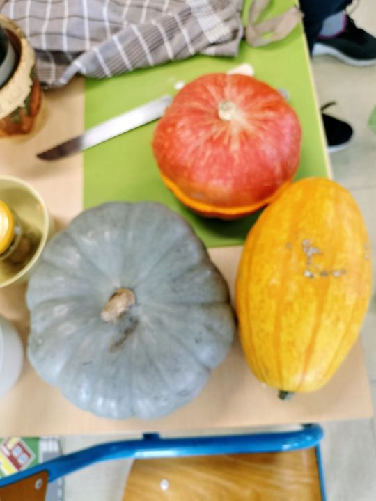 Puis les élèves ont pu déguster des graines de courge. Isabelle avait apporté quelques cucurbitacées qui produisent de telles graines: la courge bleue de Hongrie, la courge spaghetti, le potimarron. Les graines chauffées sont appréciées par les élèves qui essaient de les différencier des graines de tournesol.