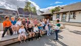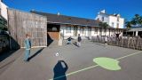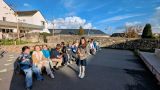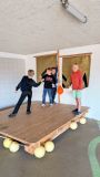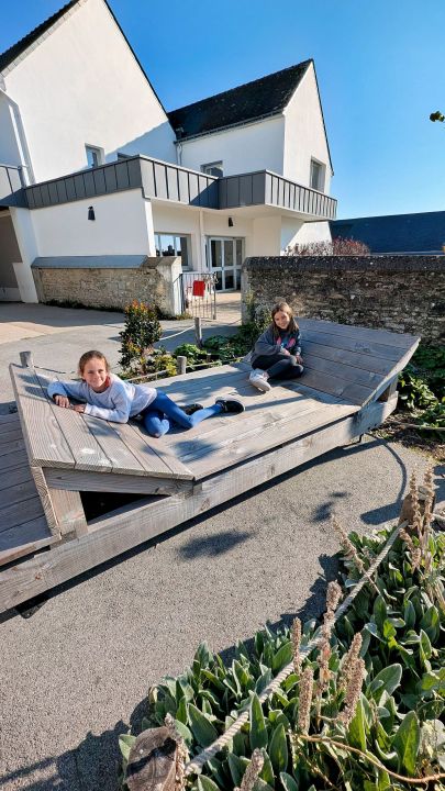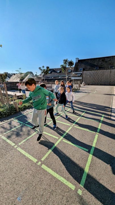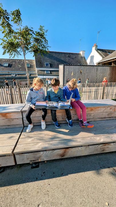 Nous avons aussi découvert notre nouvelle cour re-végétalisée l’année dernière. Il y a un transat , un parcours en bois et il ne faut pas tomber dans les copeaux de bois, un terrain de foot et un terrain de basket, des bancs en bois et un radeau. Il y a aussi beaucoup de plantes et quelques arbres.