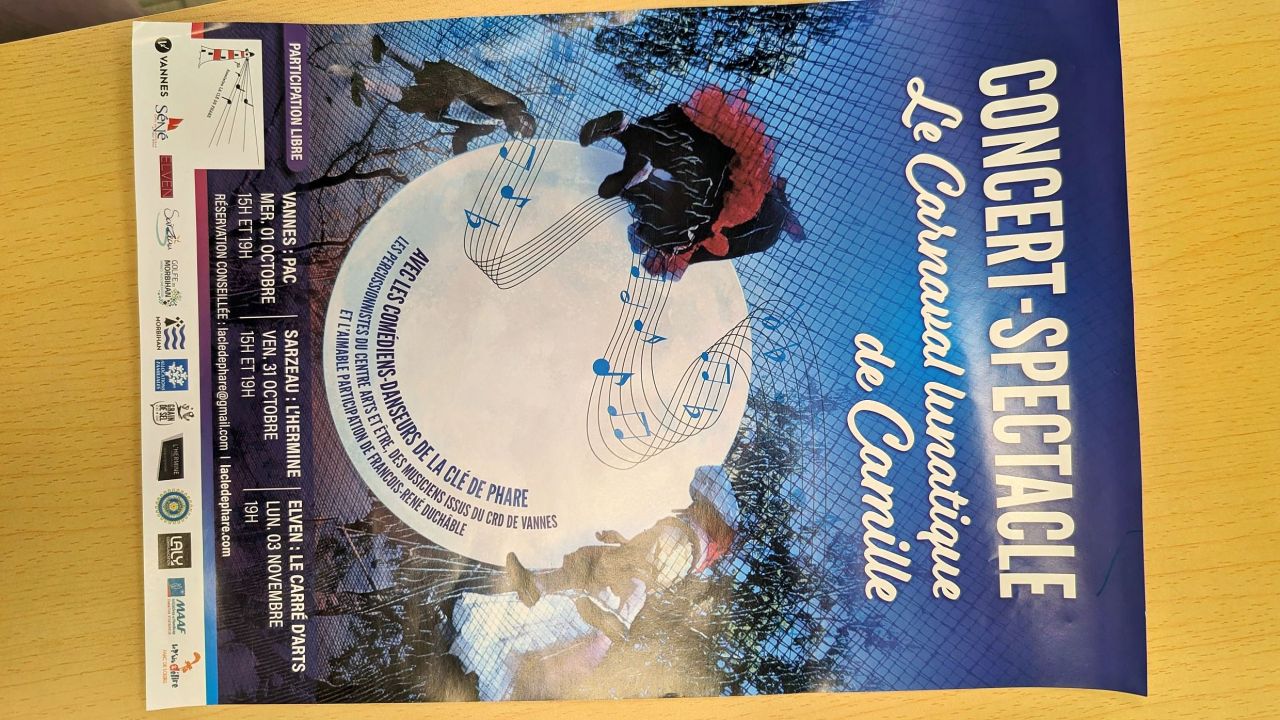 Nous sommes arrivés à Vannes devant le palais des arts. Nous sommes montés au premier étage puis nous sommes rentrés dans la salle et il y avait beaucoup de personnes et le spectacle " Le carnaval lunatique de Camille" à commencé.