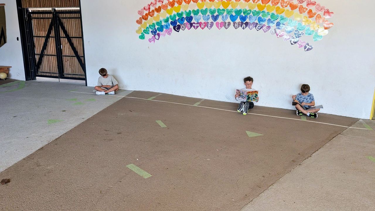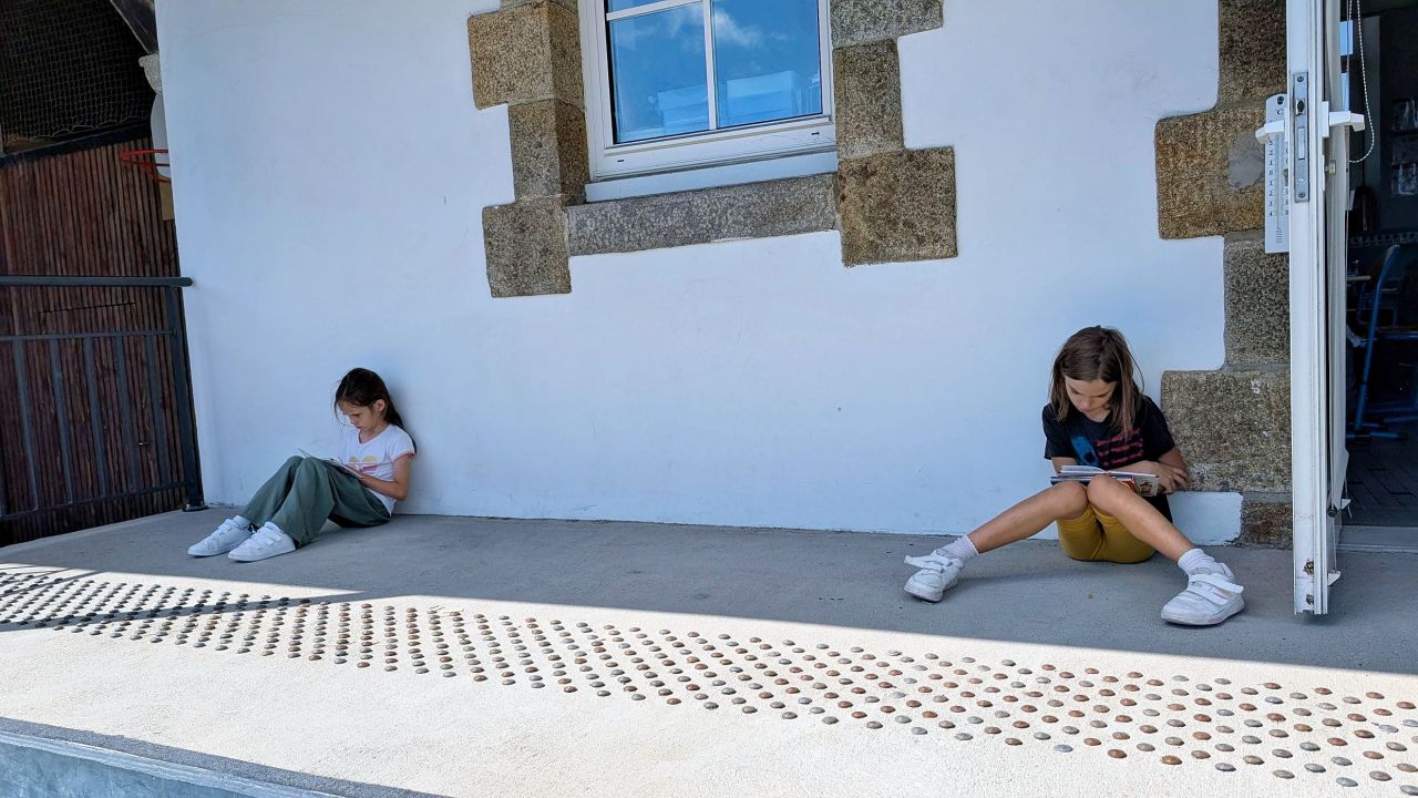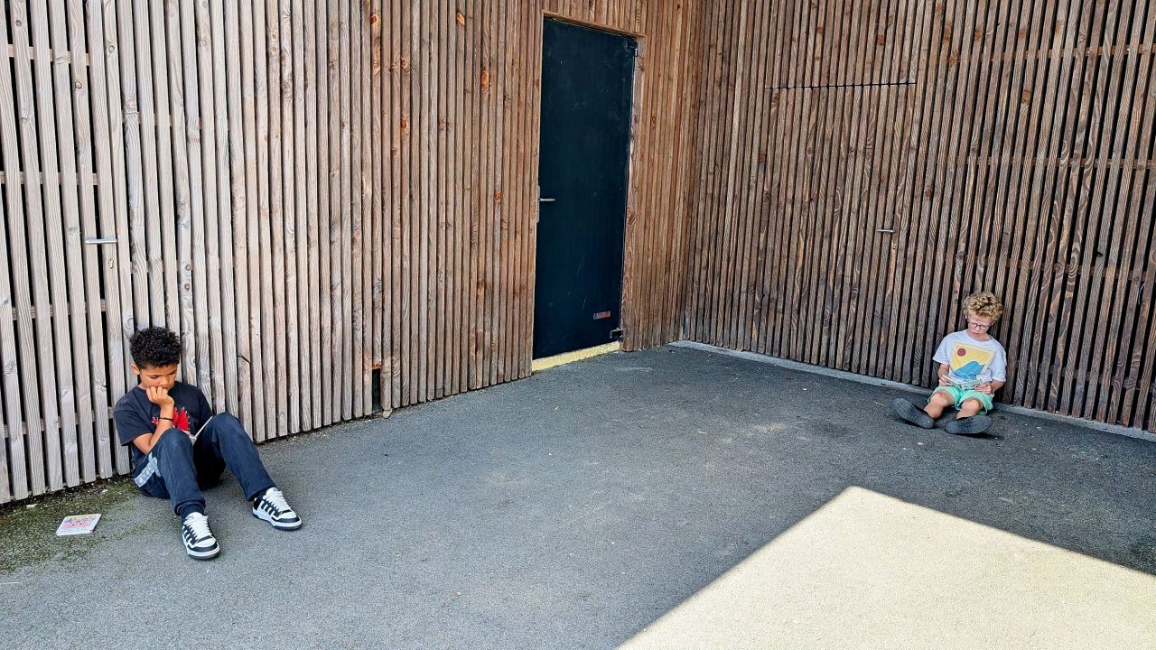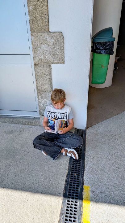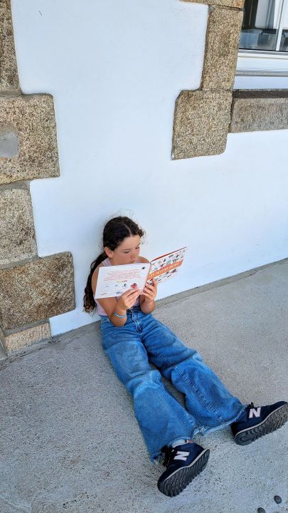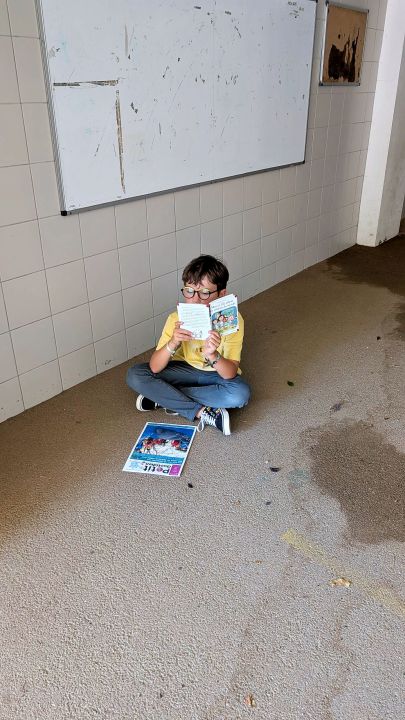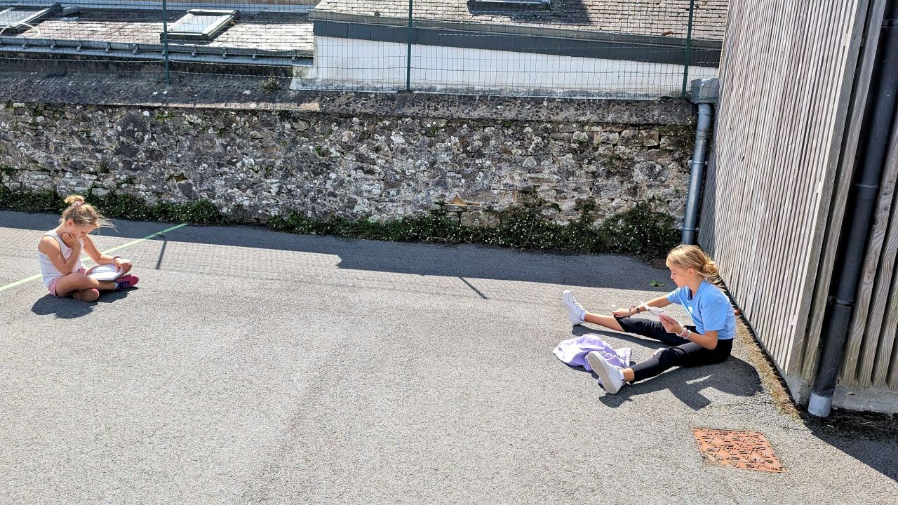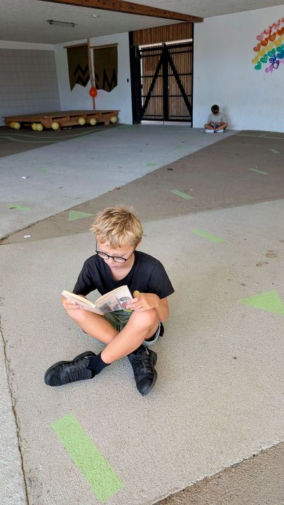 dans la cour. Nous nous installons loin des autres et dans notre bulle et puis nous lisons pendant un