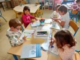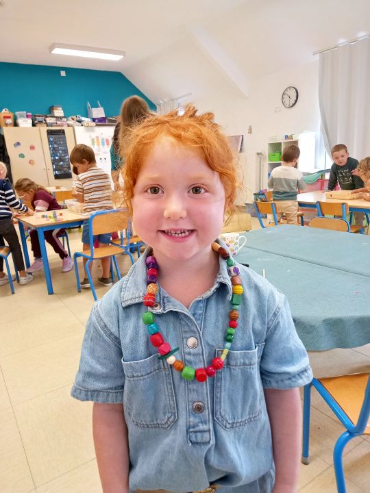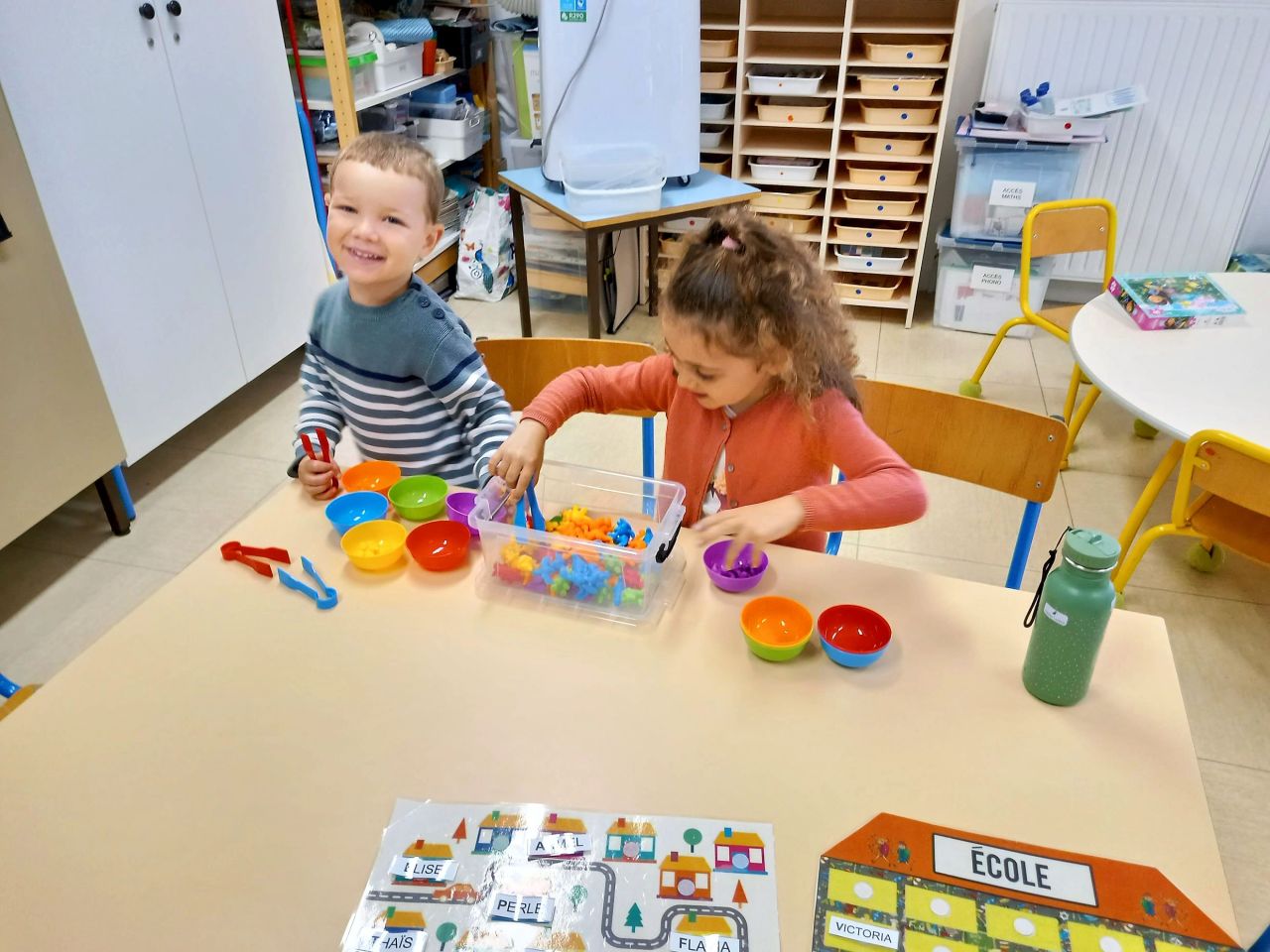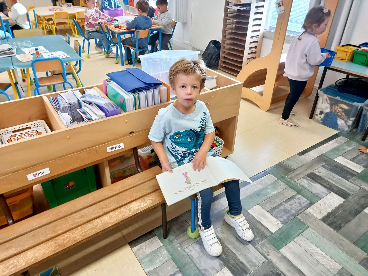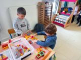 Lorsque les élèves de MS-GS entrent en classe, ils marquent leur présence puis se répartissent sur les ateliers et jeux proposés : puzzles, constructions, dessins ou coloriage, perles, coin poupées, cuisine, marchande, coin bibliothèque.