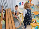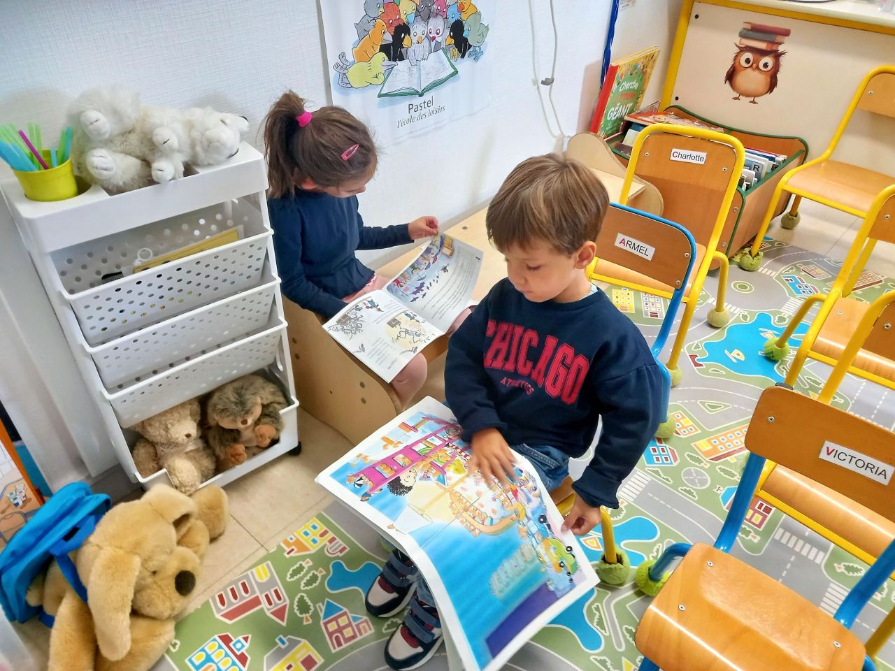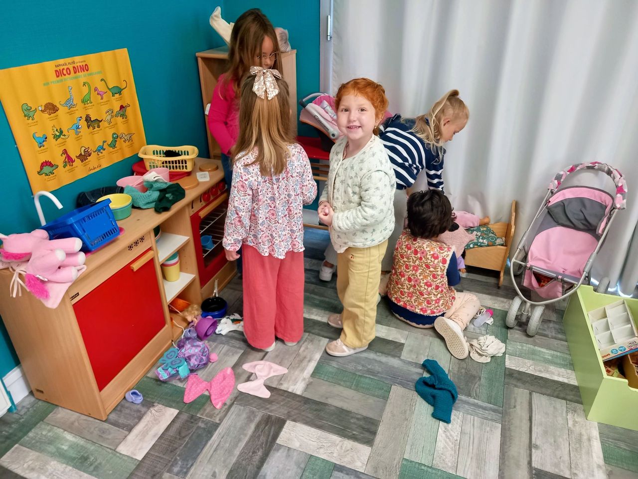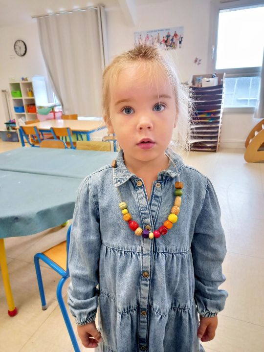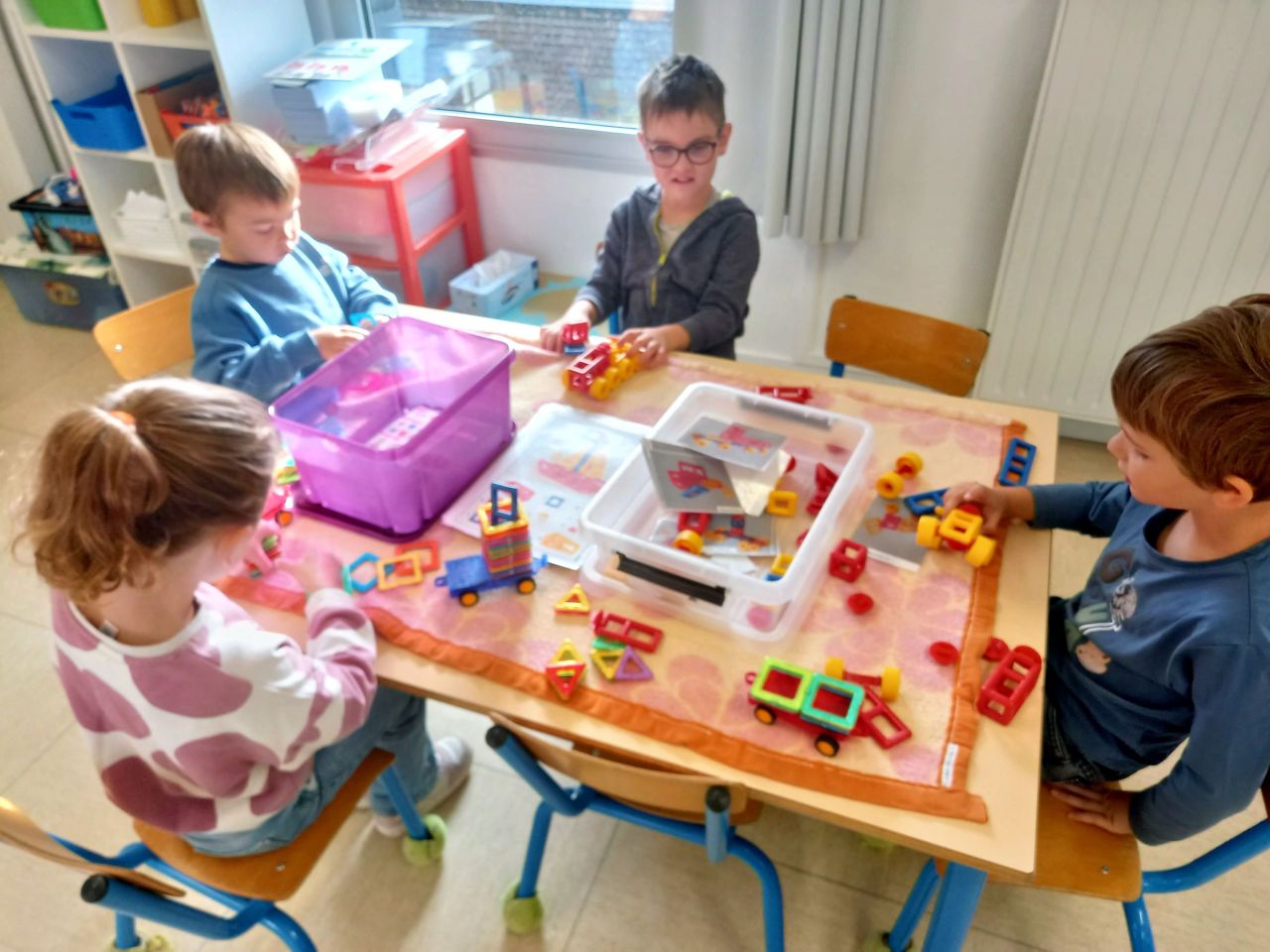 Lorsque les élèves de MS-GS entrent en classe, ils marquent leur présence puis se répartissent sur les ateliers et jeux proposés : puzzles, constructions, dessins ou coloriage, perles, coin poupées, cuisine, marchande, coin bibliothèque.