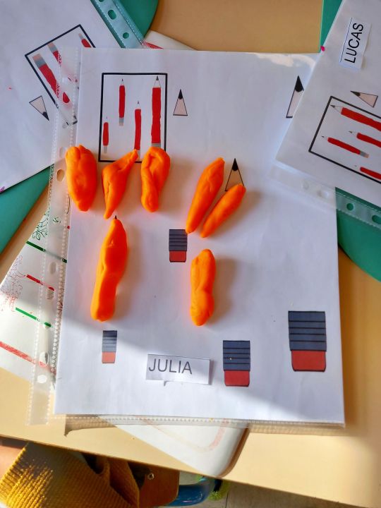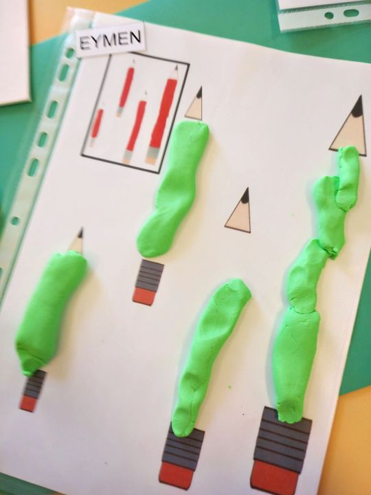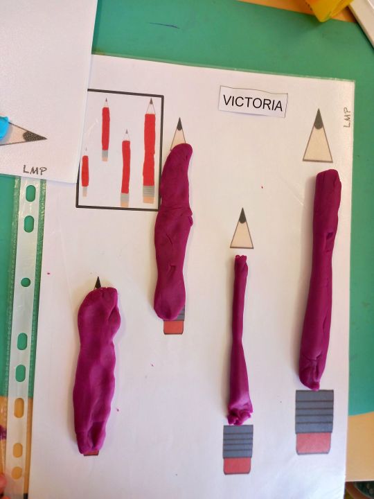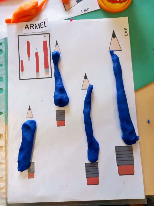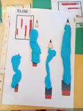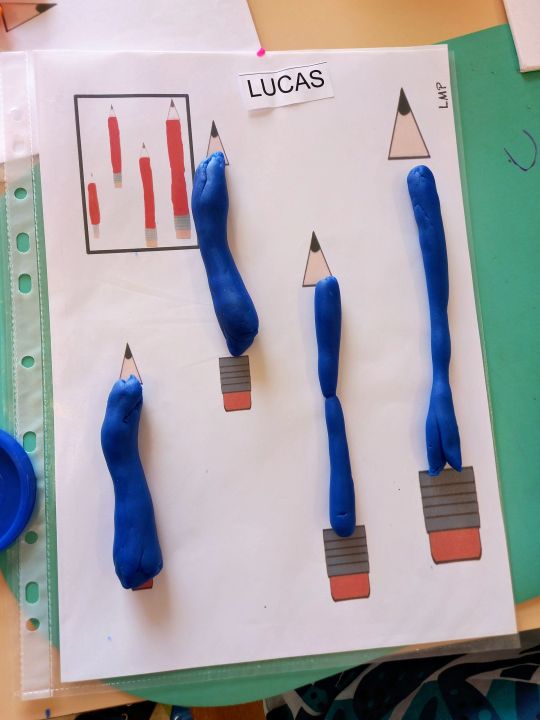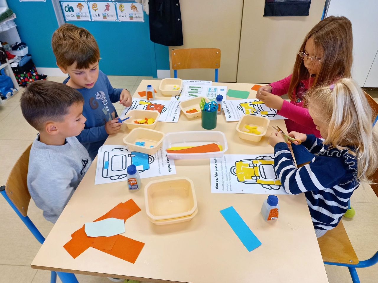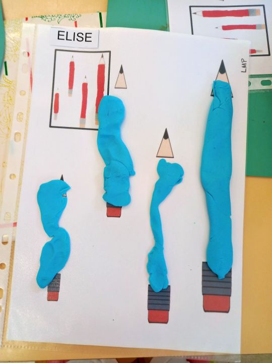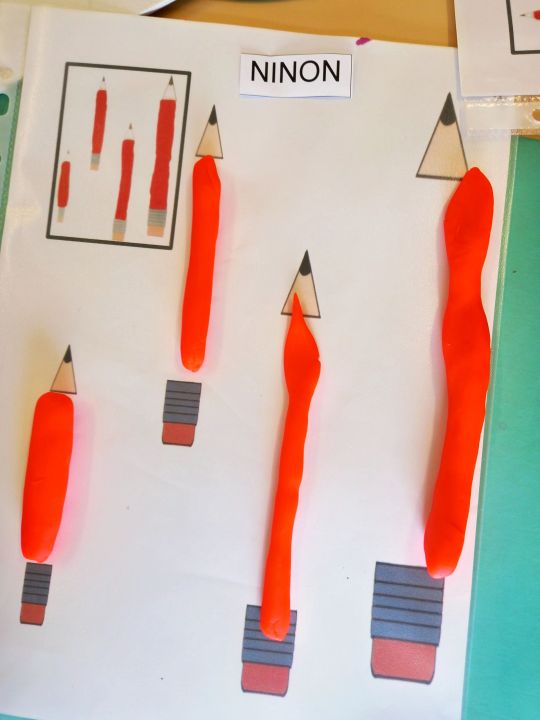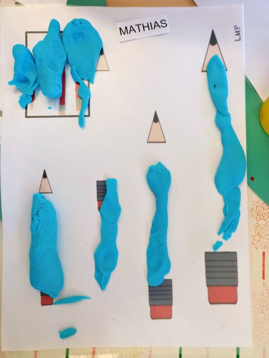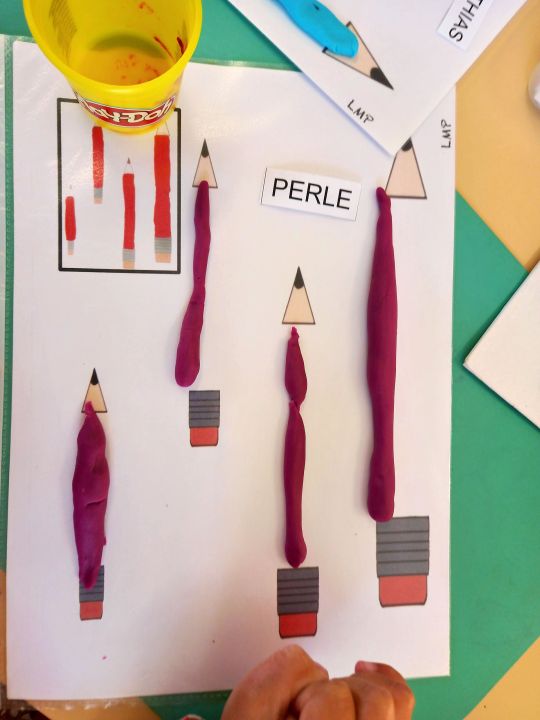 Pour se préparer à l'écriture, les élèves exercent leur motricité fine : découpage, collage, pâte à modeler.