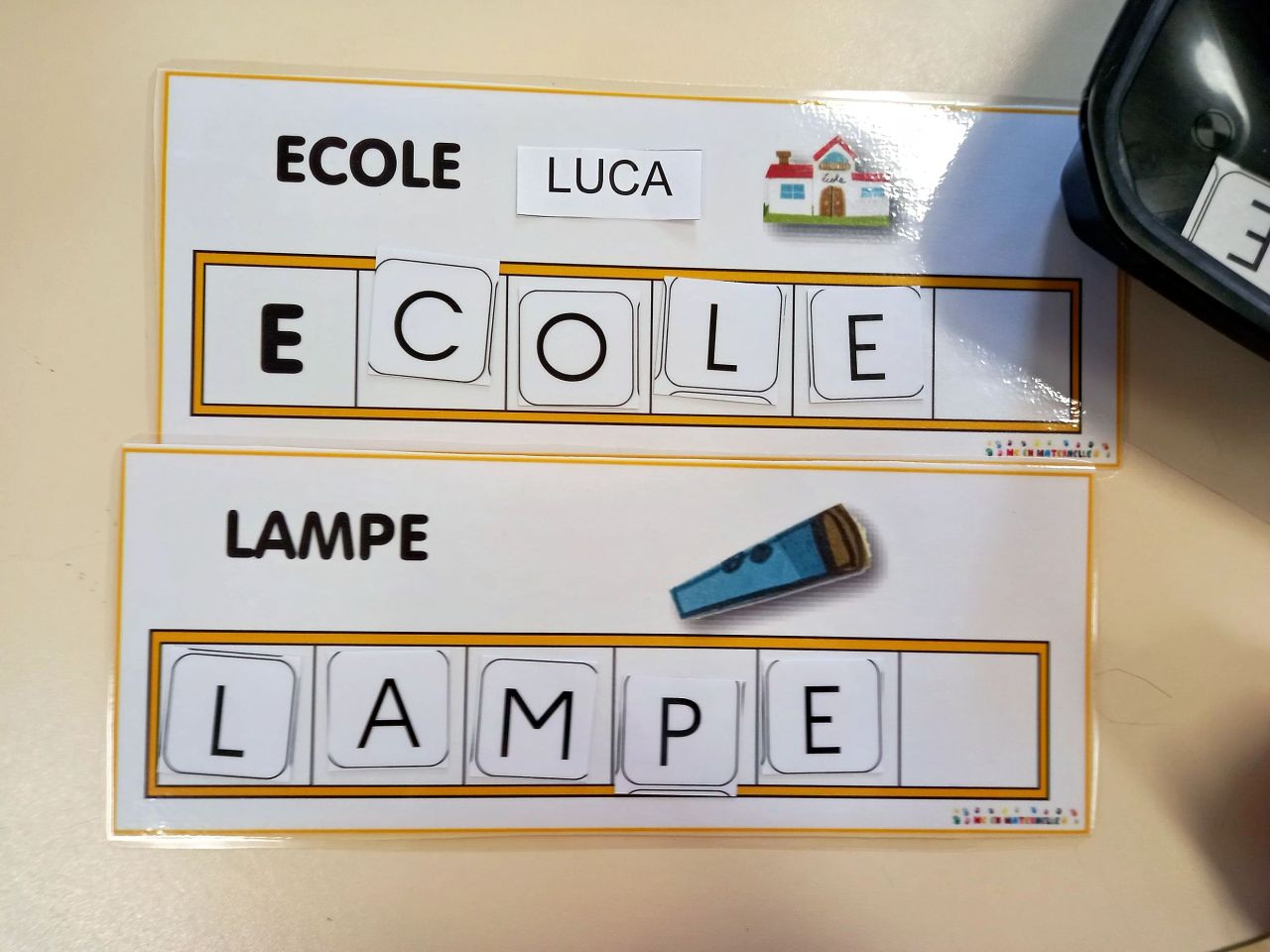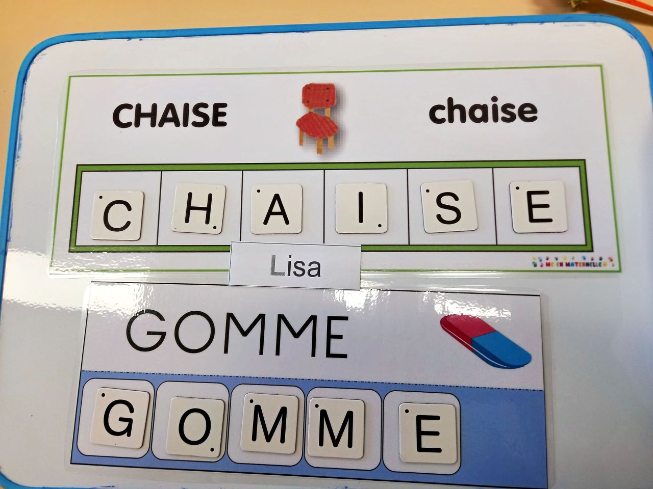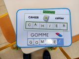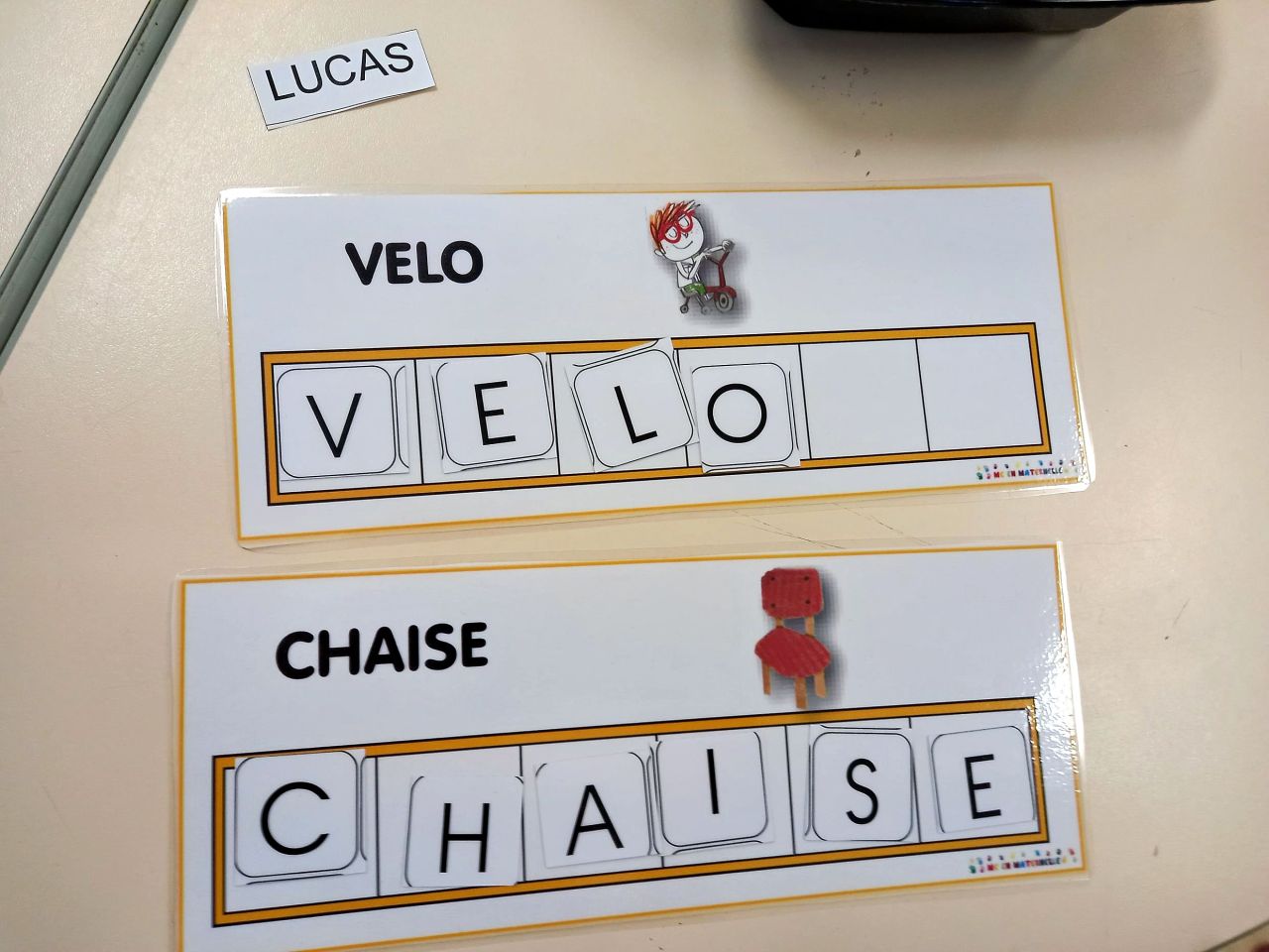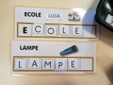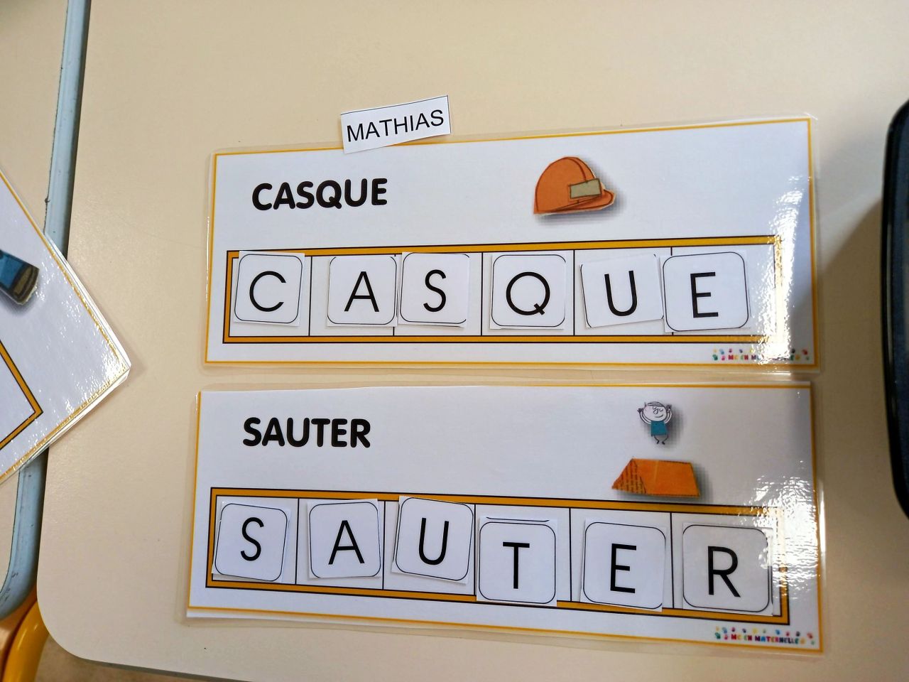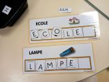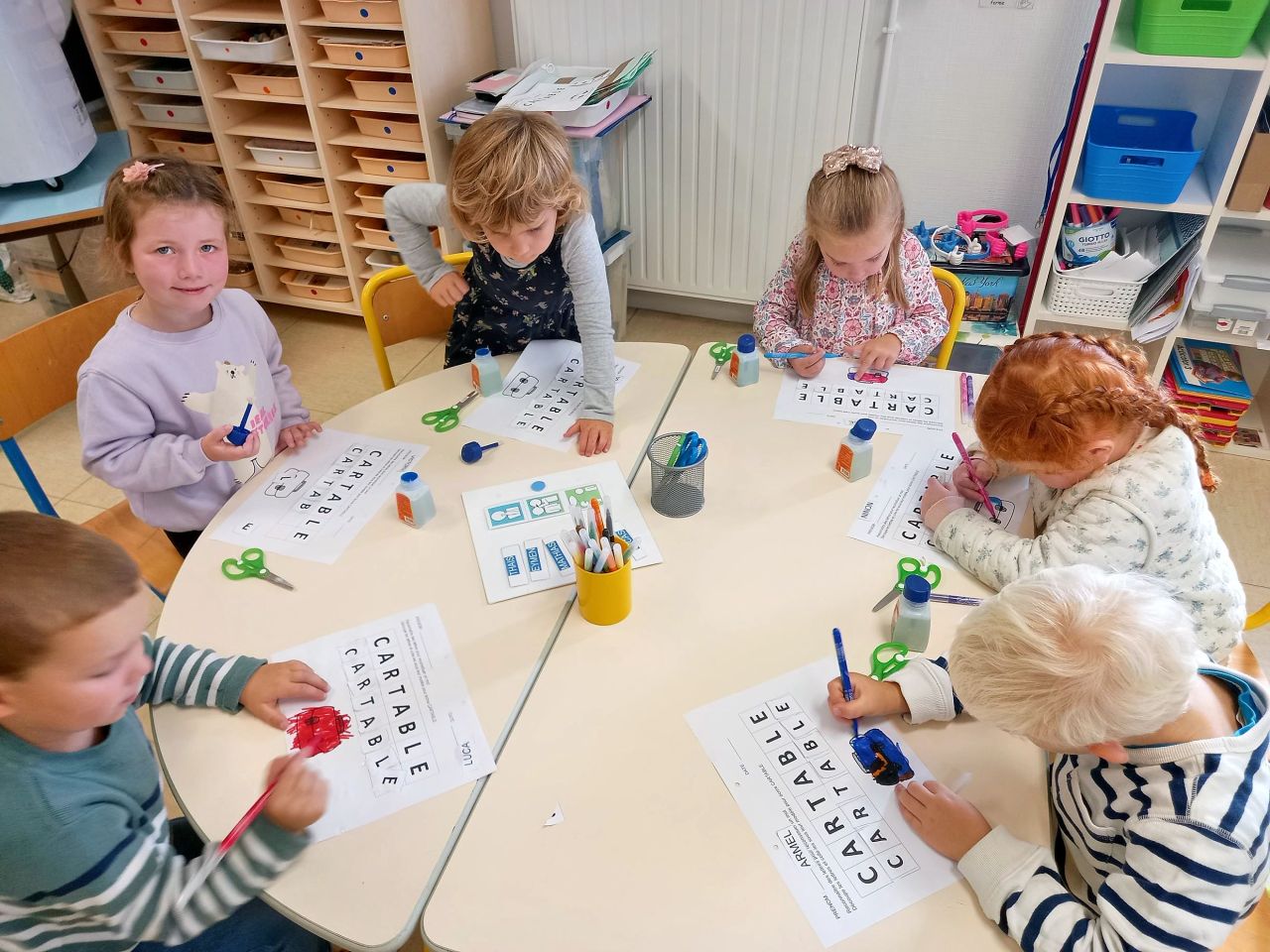 Pour se préparer à la lecture, les GS reconstituent des mots avec des lettres mobiles, les MS aussi mais eux placent les lettres sur le modèle. Ils reconnaissent les lettres qui composent leur prénom et décorent un cartable coloré à l'encre.