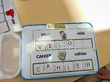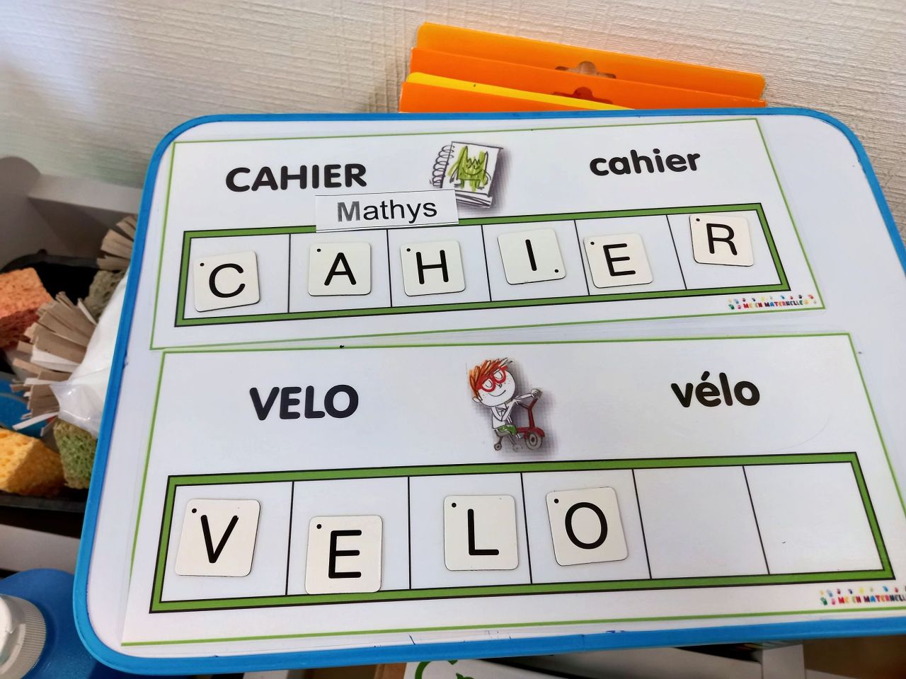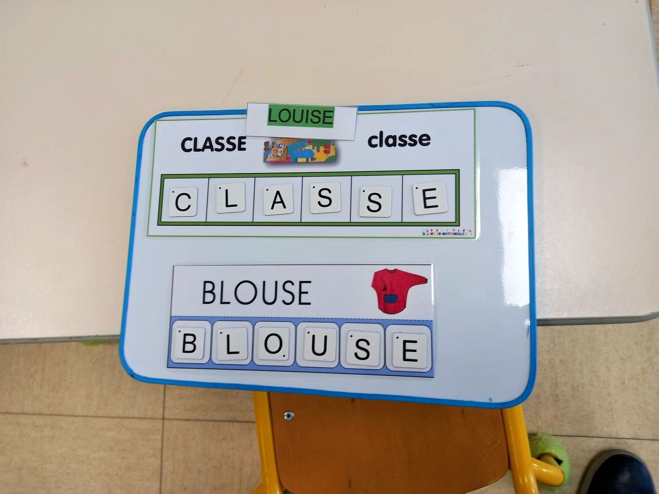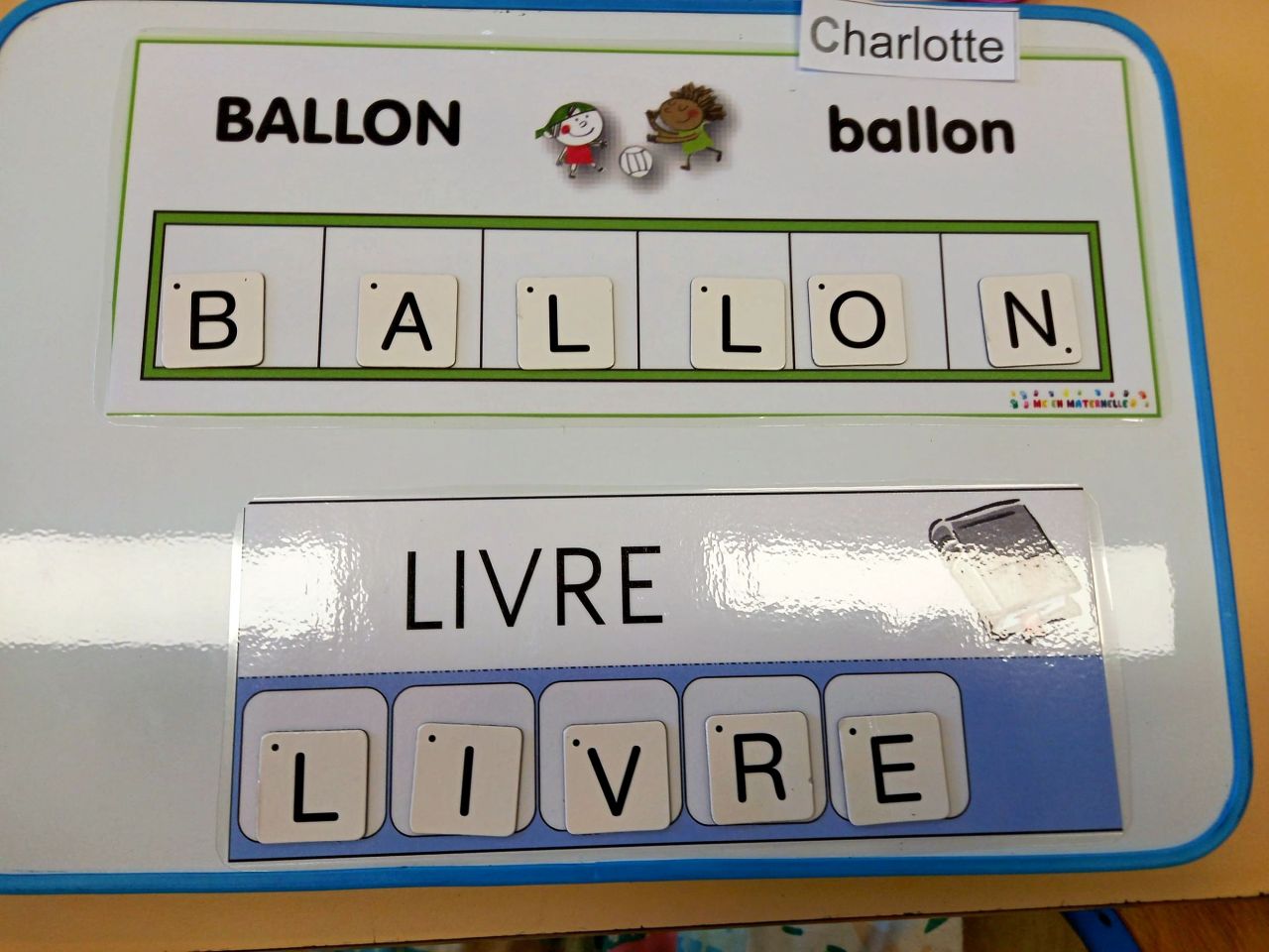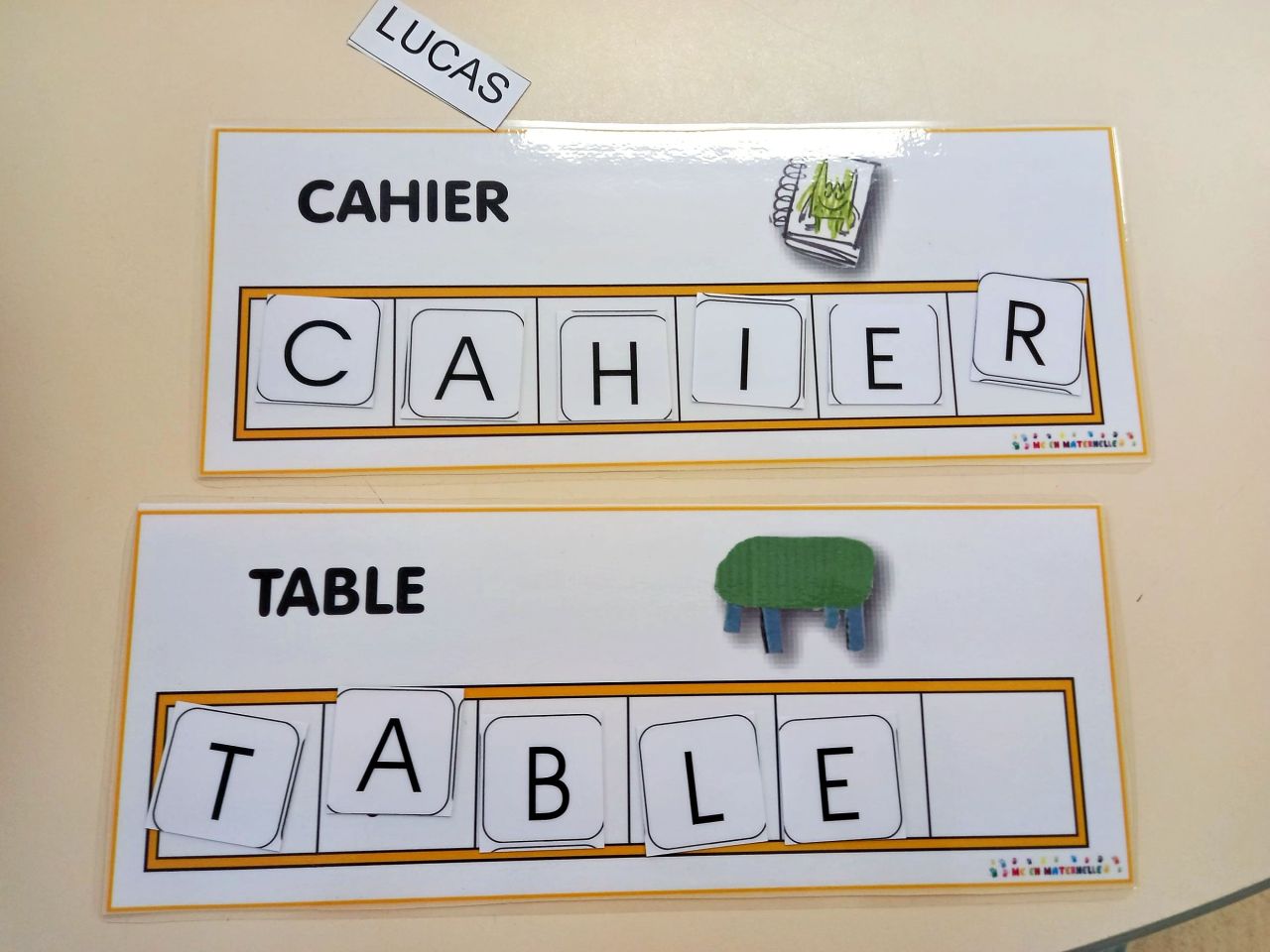 Pour se préparer à la lecture, les GS reconstituent des mots avec des lettres mobiles, les MS aussi mais eux placent les lettres sur le modèle. Ils reconnaissent les lettres qui composent leur prénom et décorent un cartable coloré à l'encre.