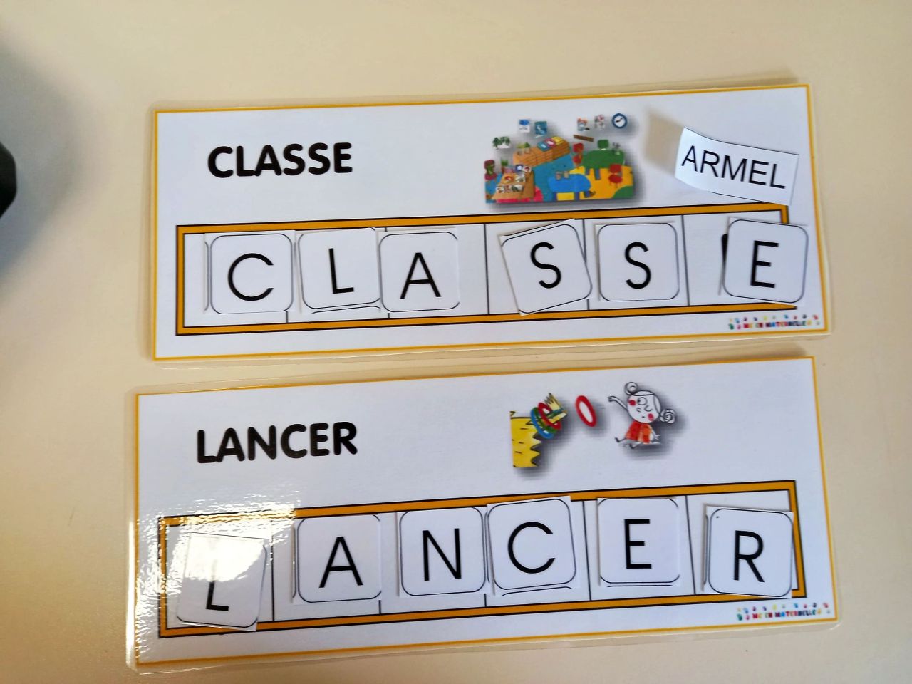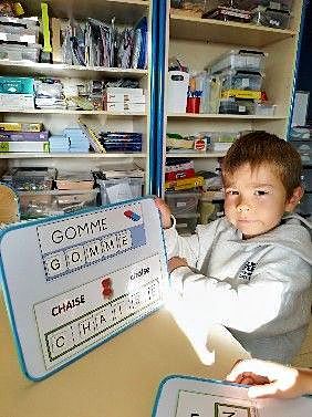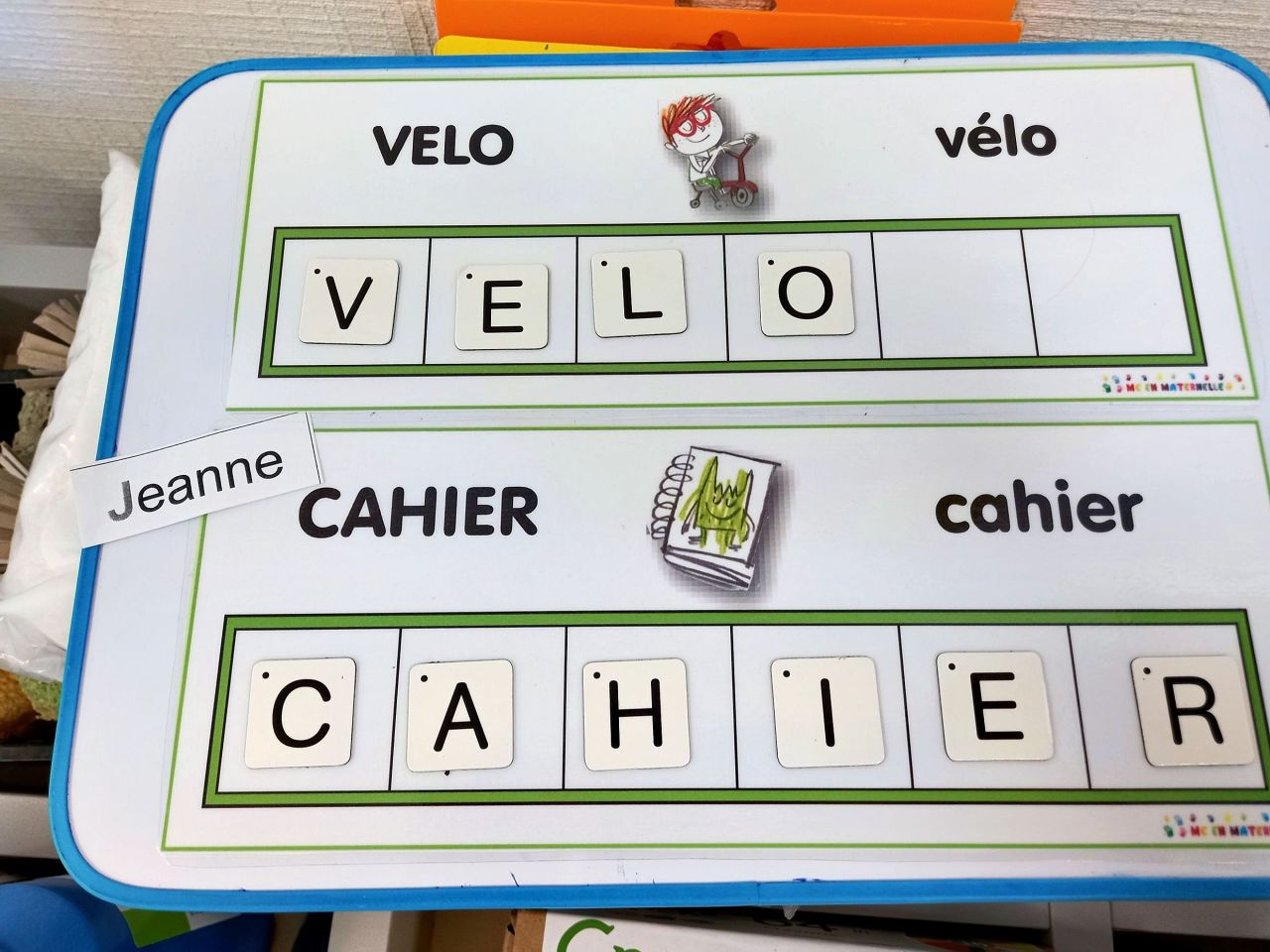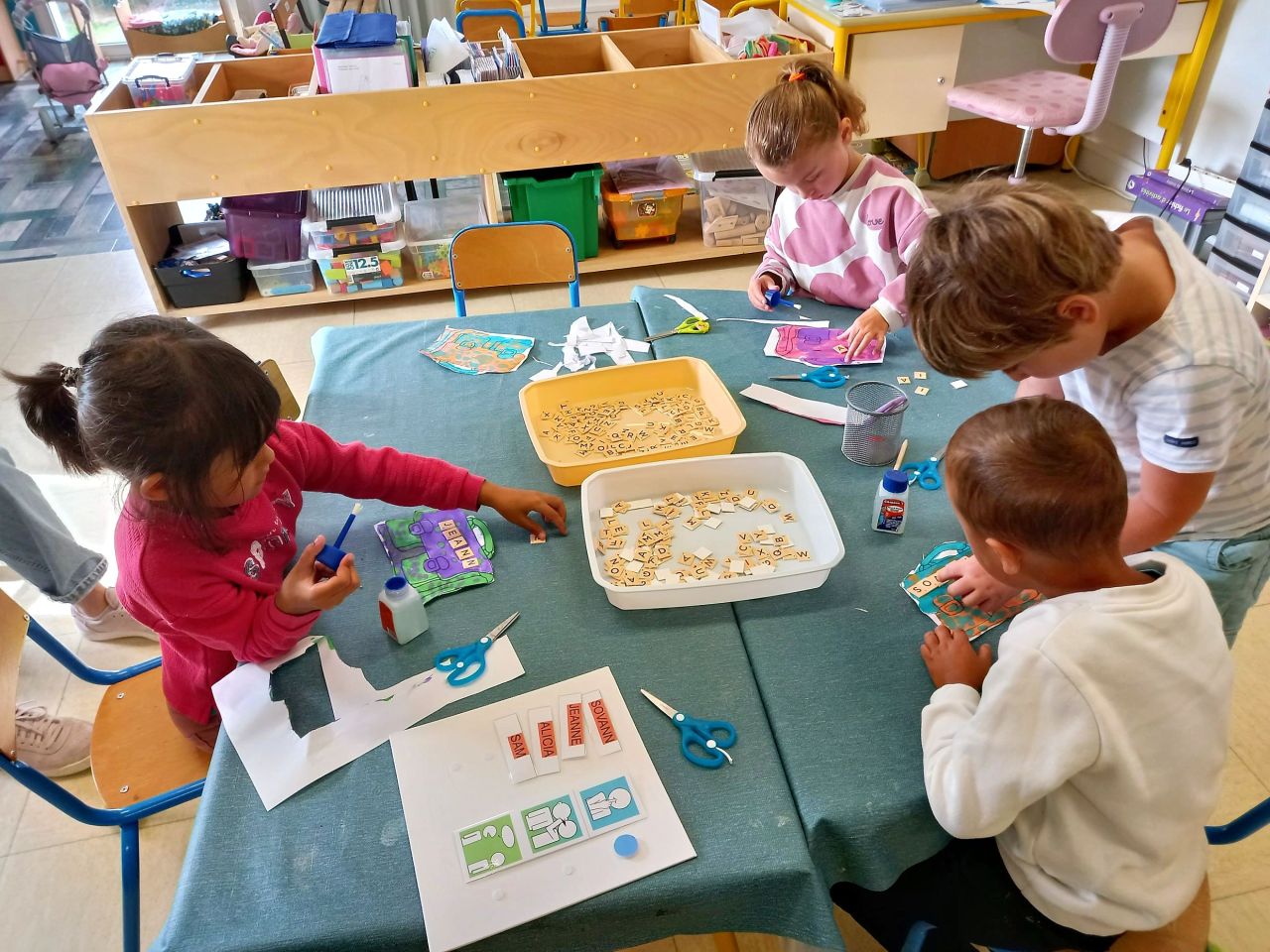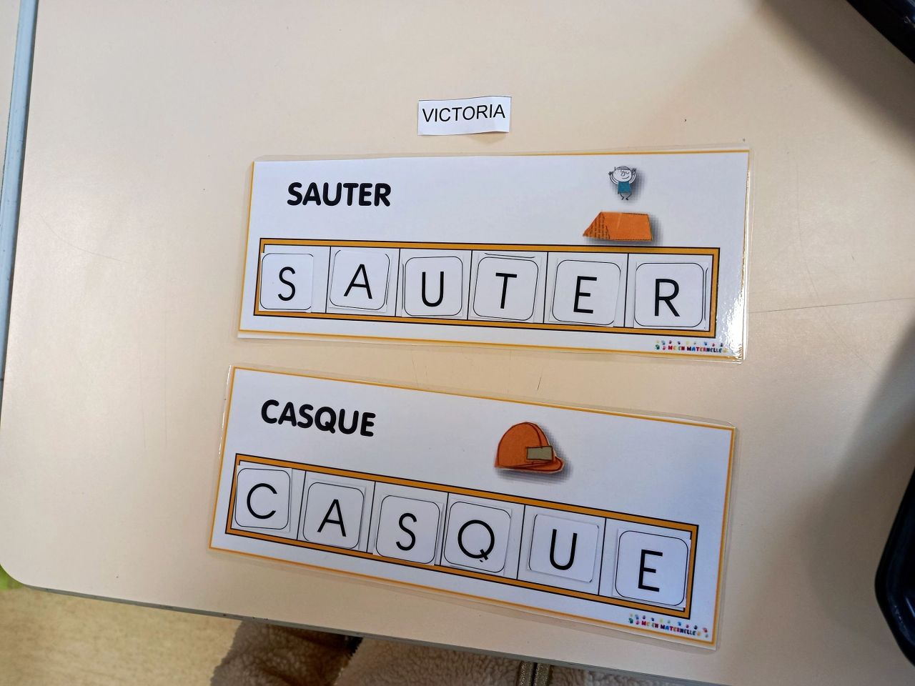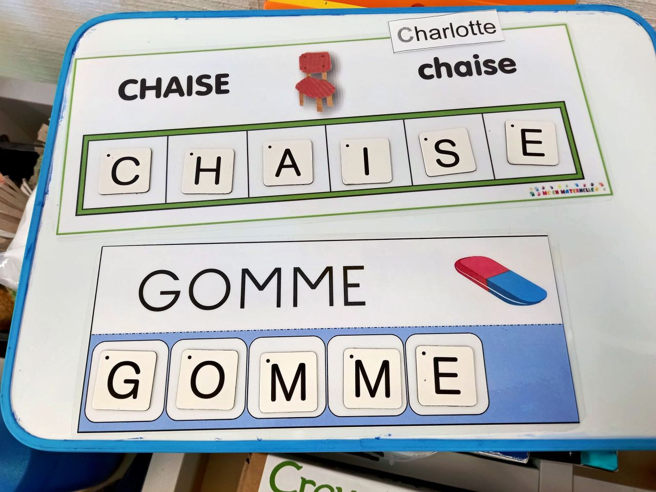 Pour se préparer à la lecture, les GS reconstituent des mots avec des lettres mobiles, les MS aussi mais eux placent les lettres sur le modèle. Ils reconnaissent les lettres qui composent leur prénom et décorent un cartable coloré à l'encre.