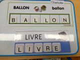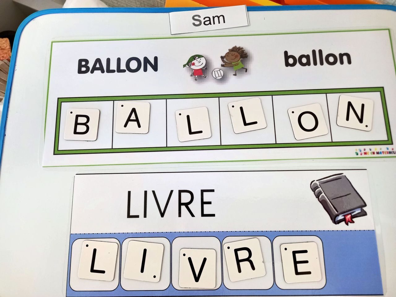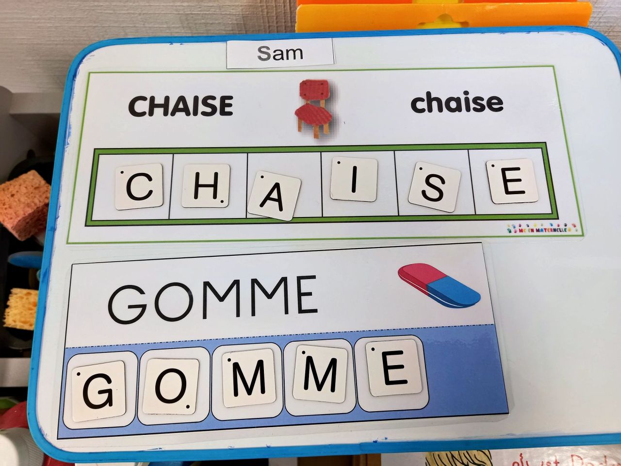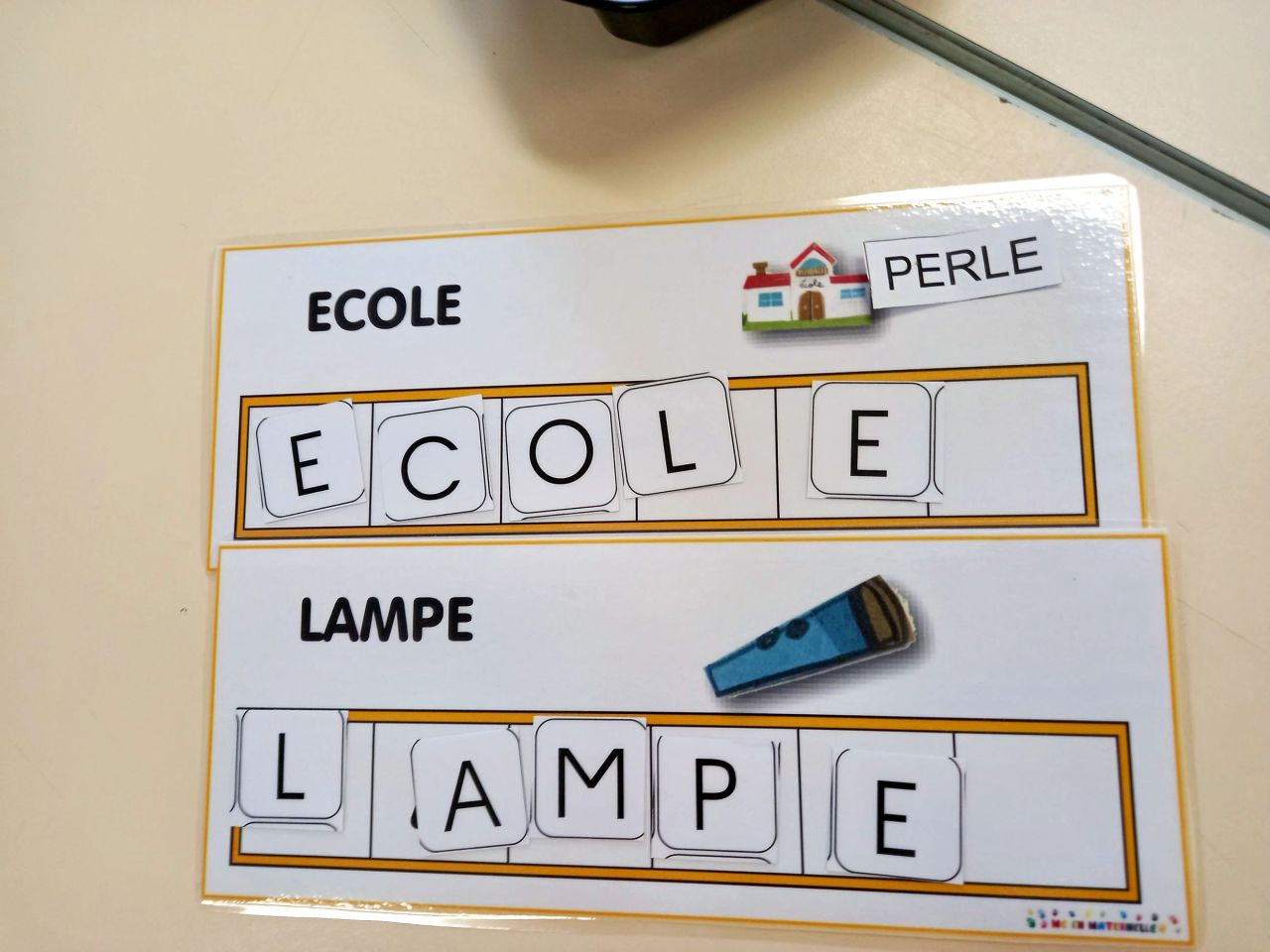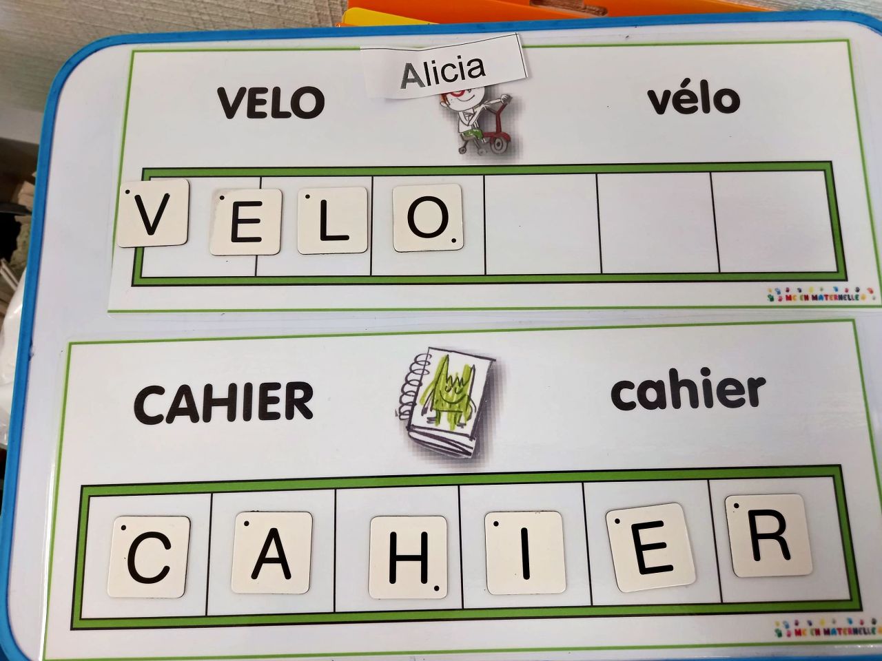 Pour se préparer à la lecture, les GS reconstituent des mots avec des lettres mobiles, les MS aussi mais eux placent les lettres sur le modèle. Ils reconnaissent les lettres qui composent leur prénom et décorent un cartable coloré à l'encre.