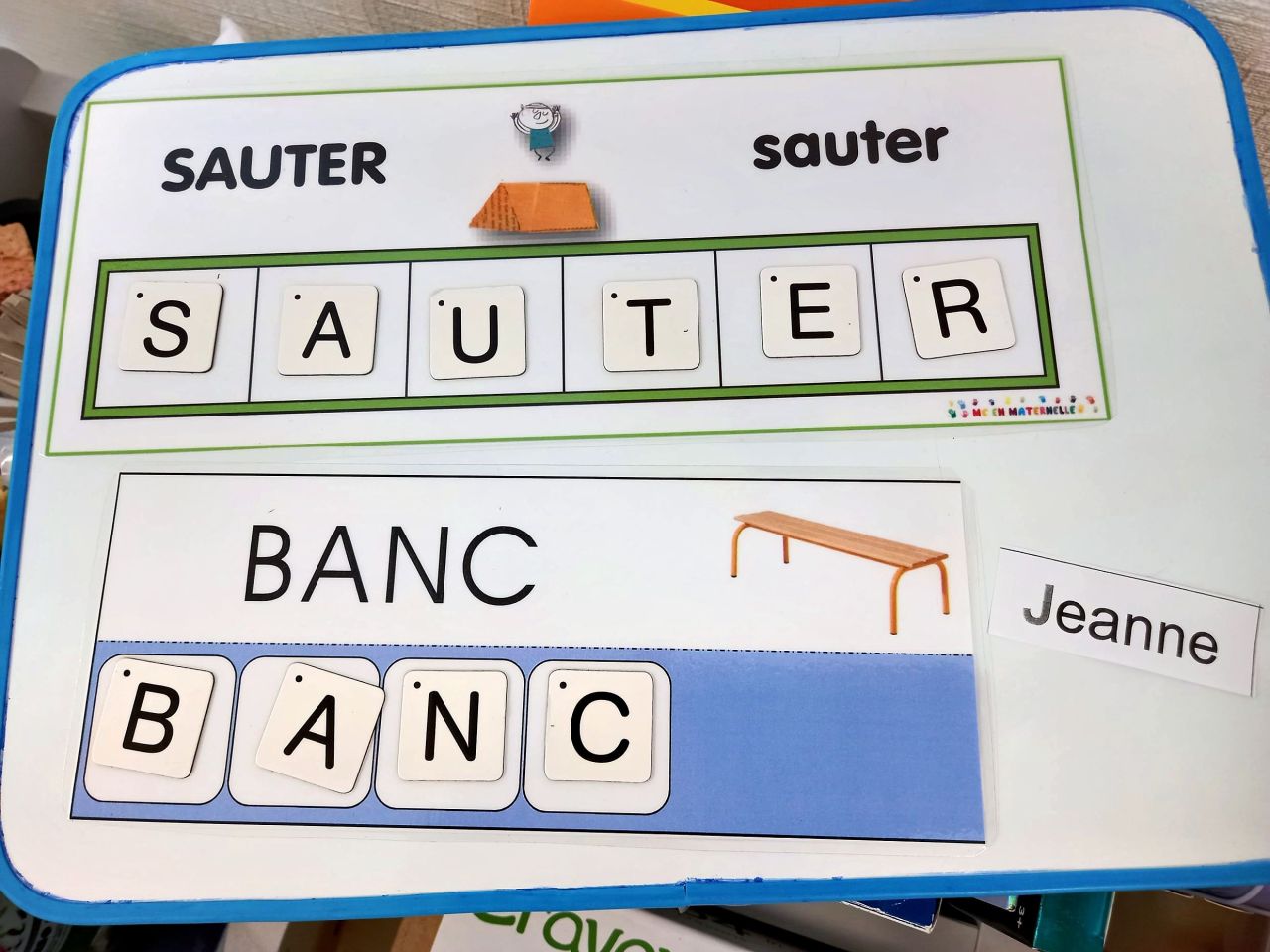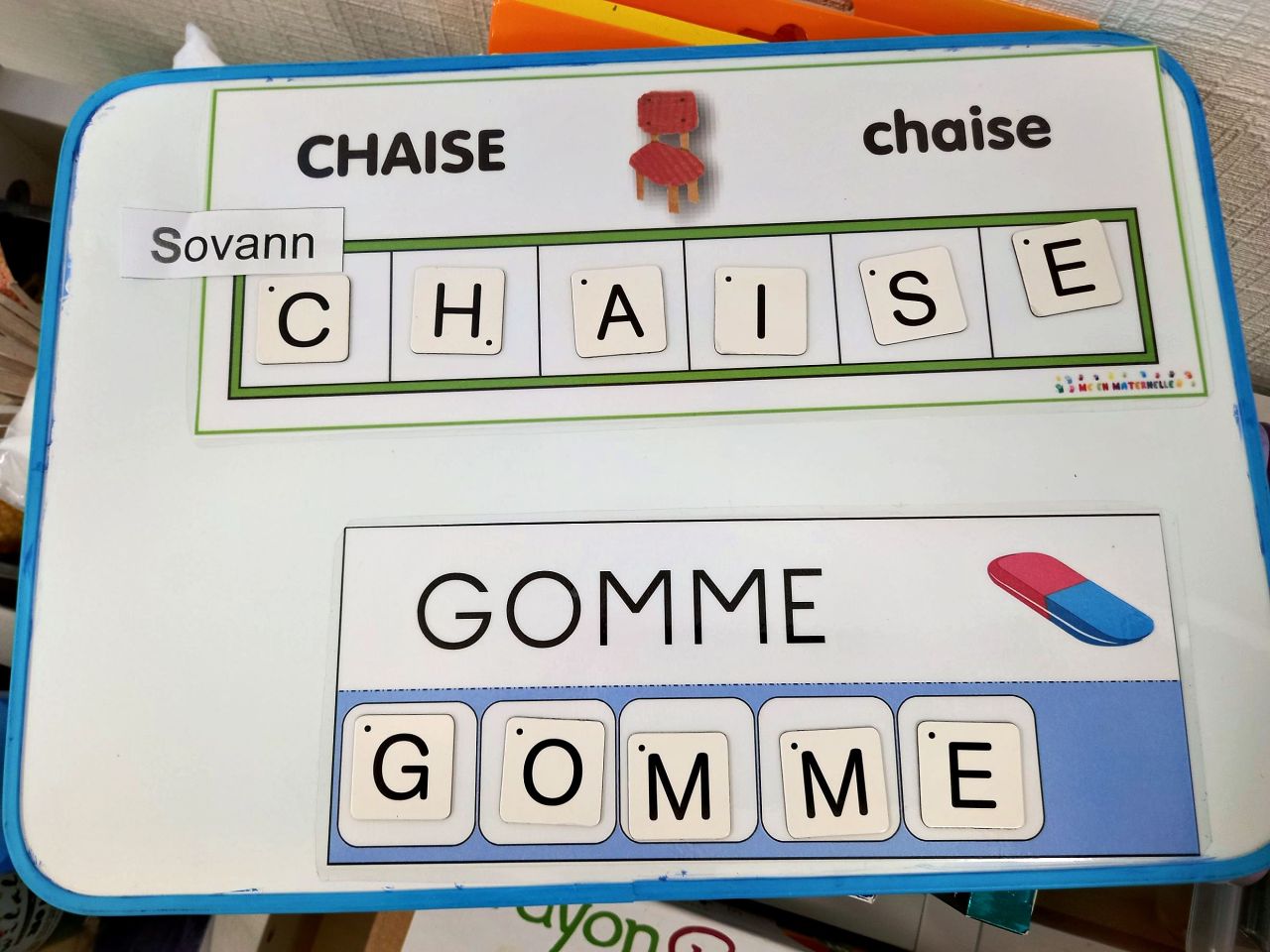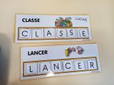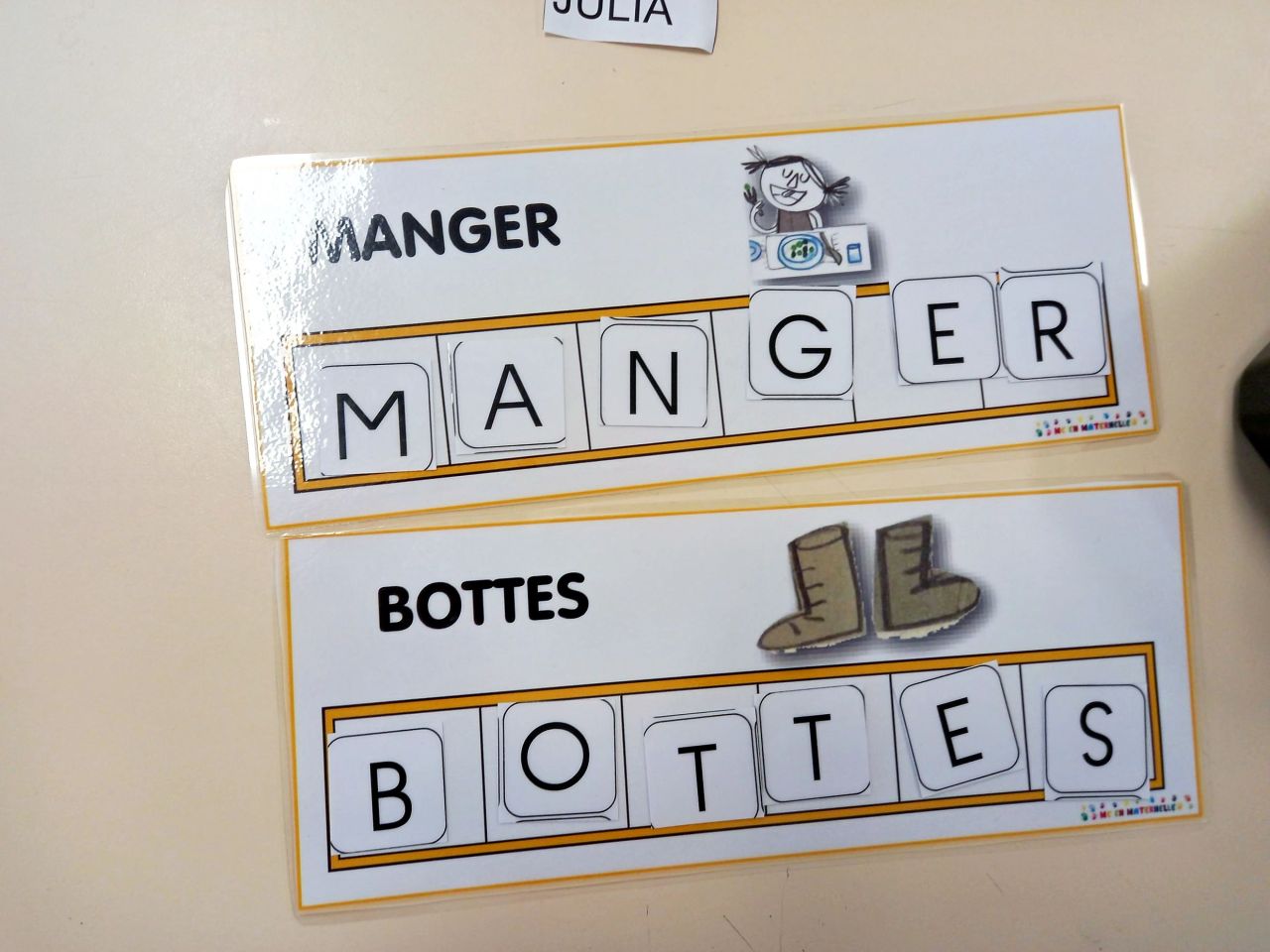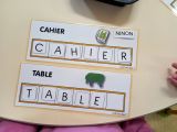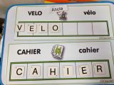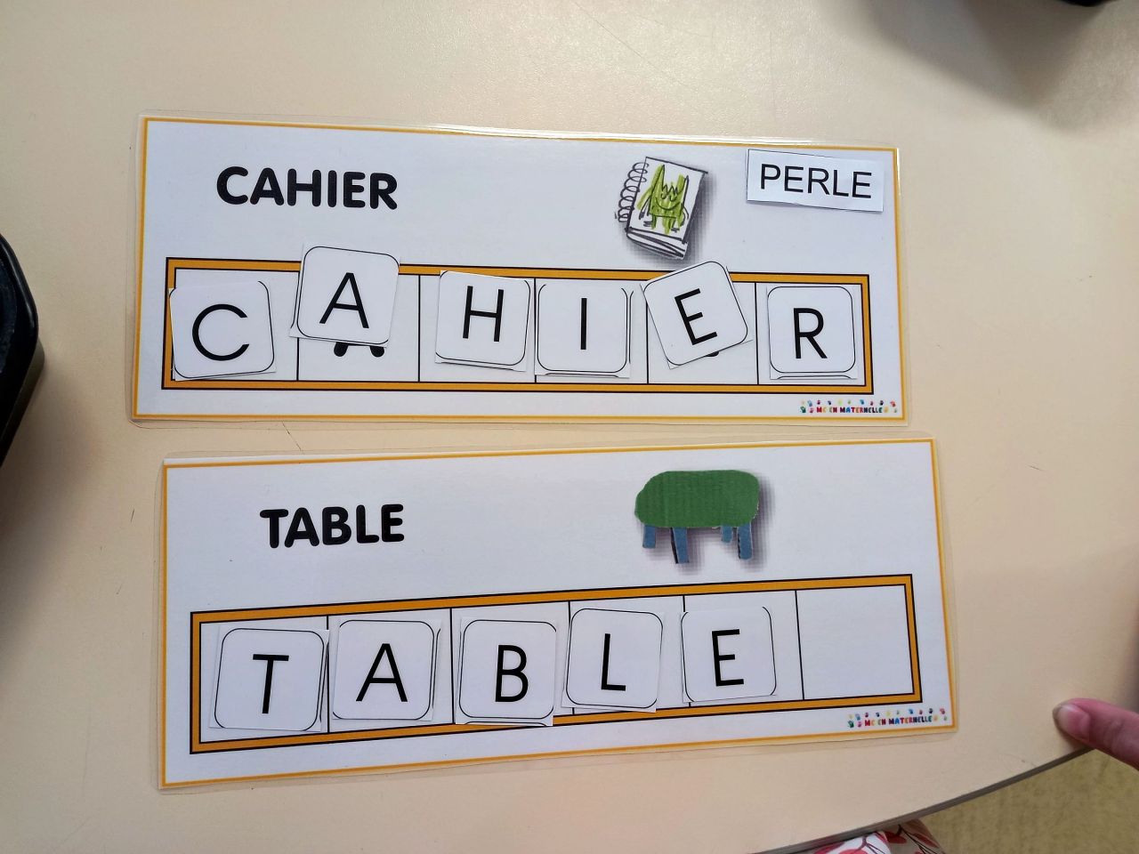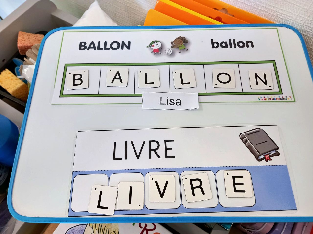 Pour se préparer à la lecture, les GS reconstituent des mots avec des lettres mobiles, les MS aussi mais eux placent les lettres sur le modèle. Ils reconnaissent les lettres qui composent leur prénom et décorent un cartable coloré à l'encre.