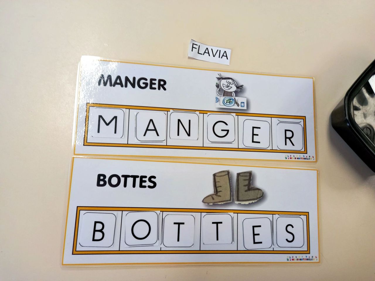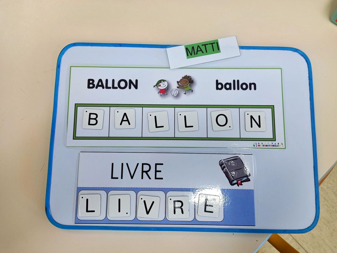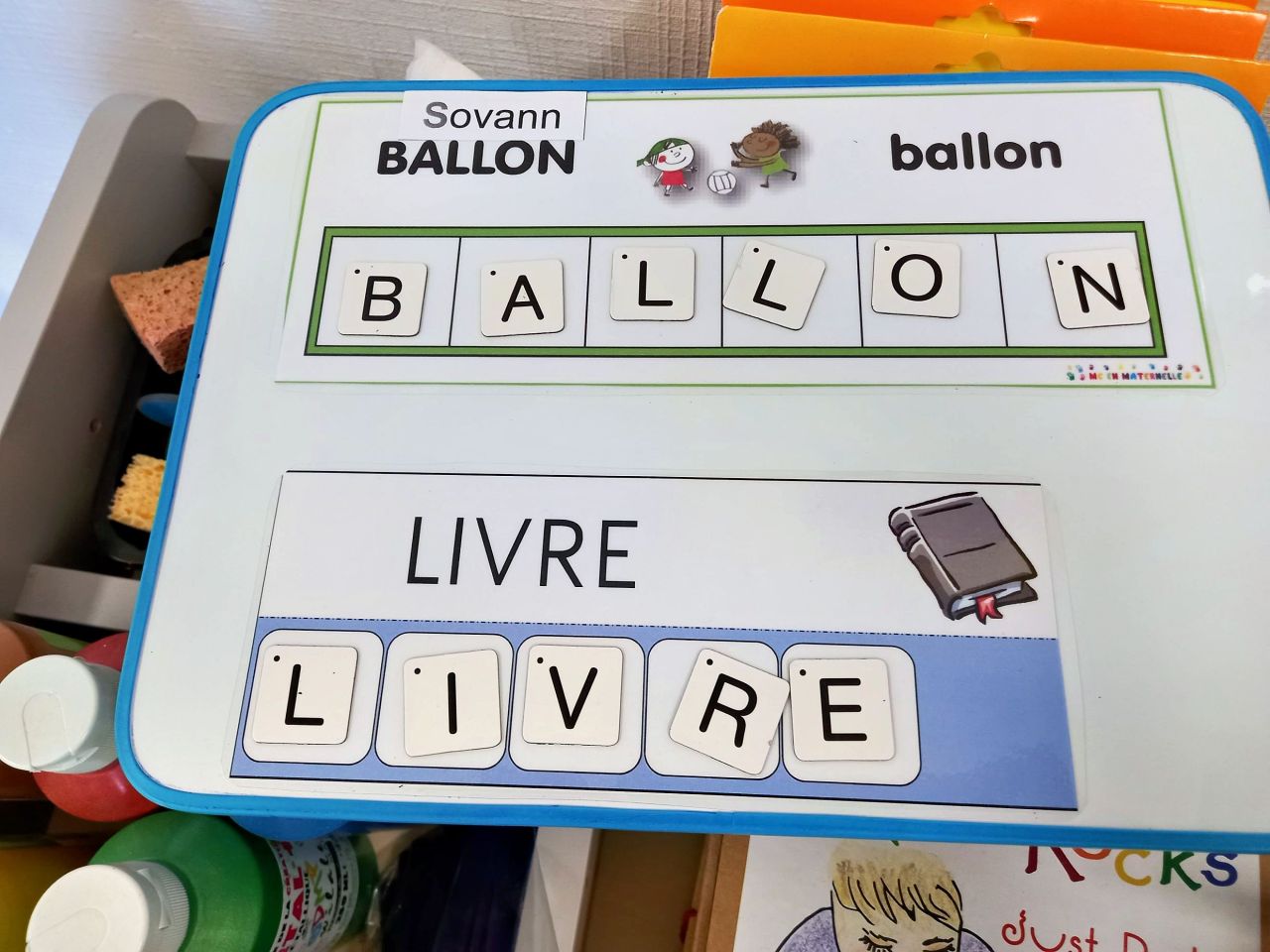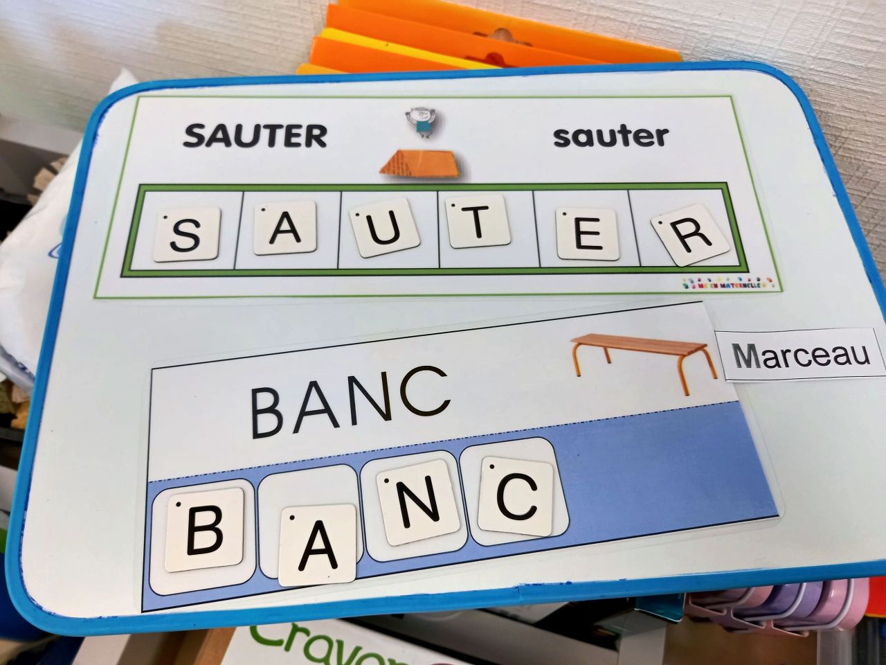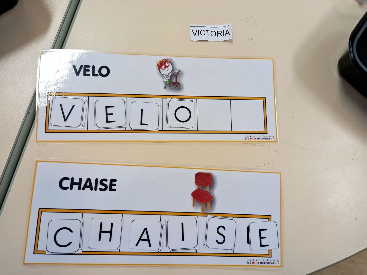Pour se préparer à la lecture, les GS reconstituent des mots avec des lettres mobiles, les MS aussi mais eux placent les lettres sur le modèle. Ils reconnaissent les lettres qui composent leur prénom et décorent un cartable coloré à l'encre.