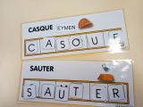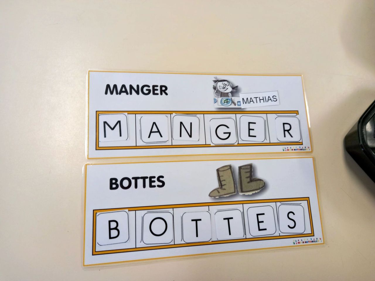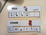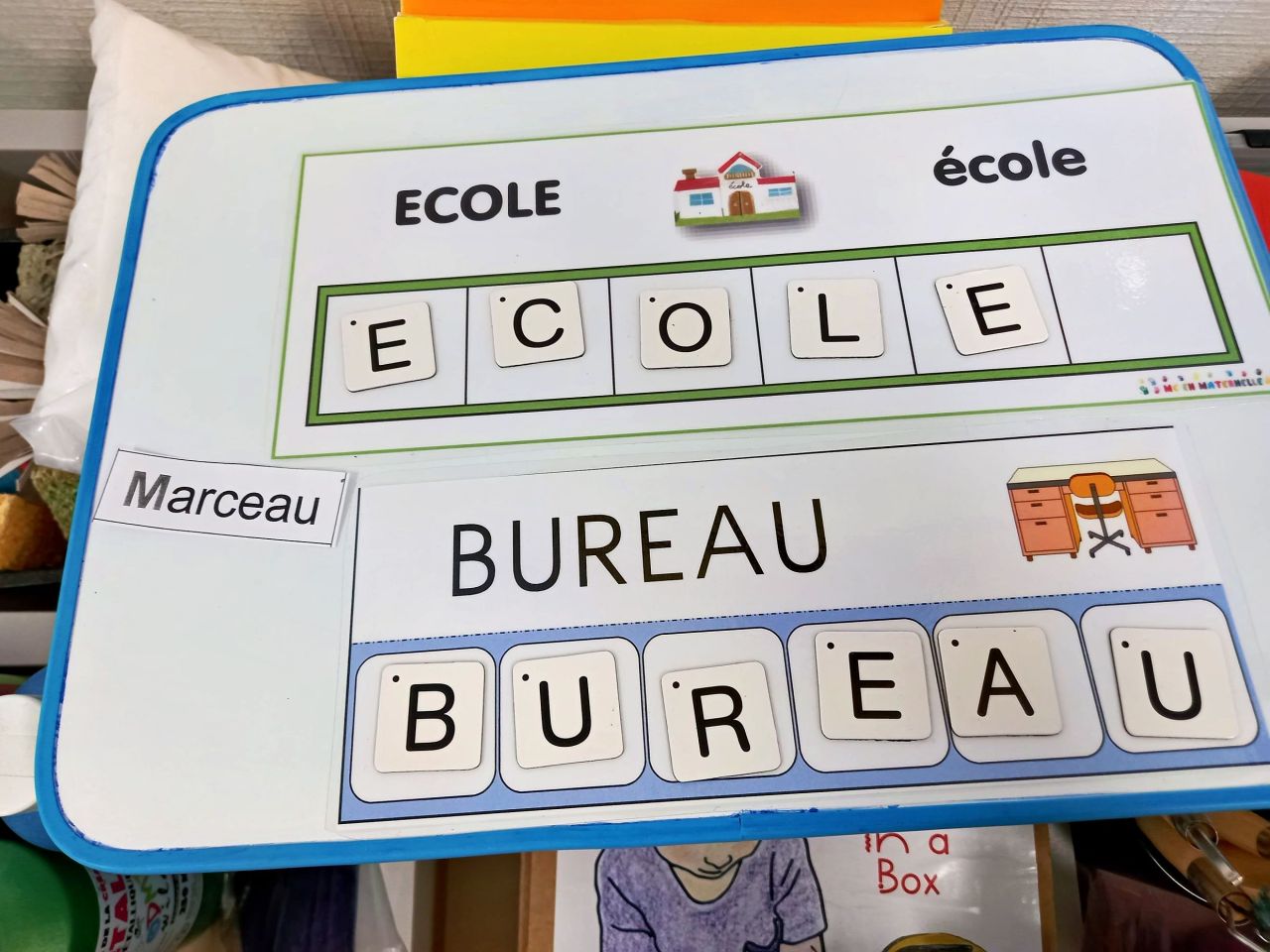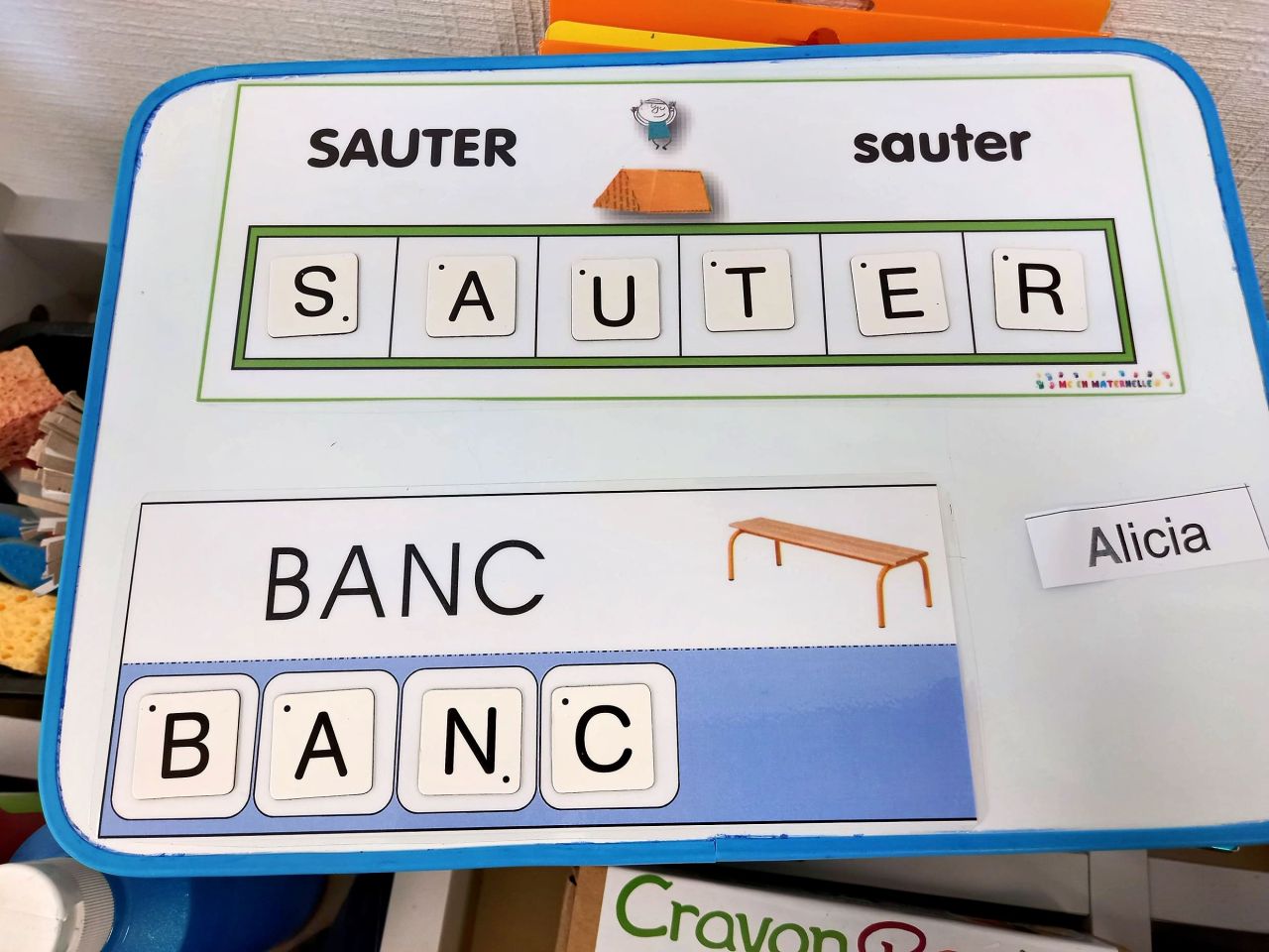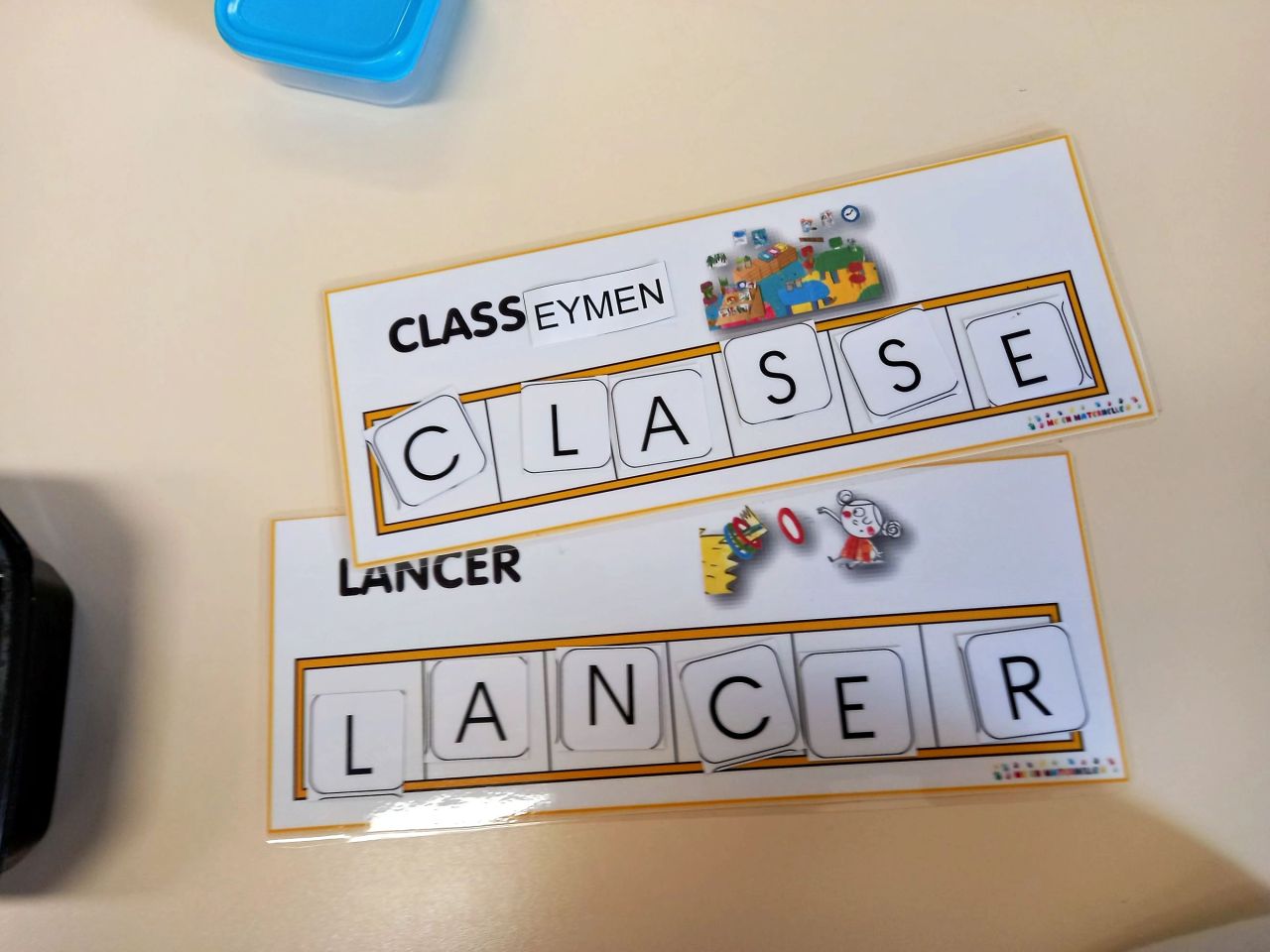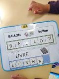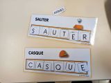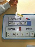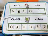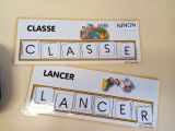 Pour se préparer à la lecture, les GS reconstituent des mots avec des lettres mobiles, les MS aussi mais eux placent les lettres sur le modèle. Ils reconnaissent les lettres qui composent leur prénom et décorent un cartable coloré à l'encre.