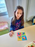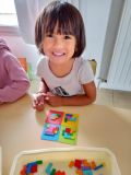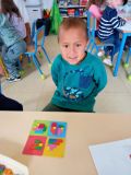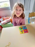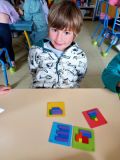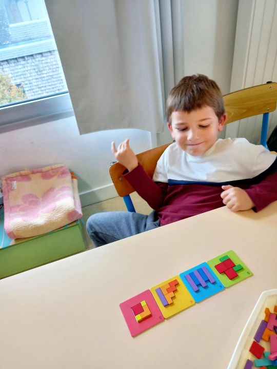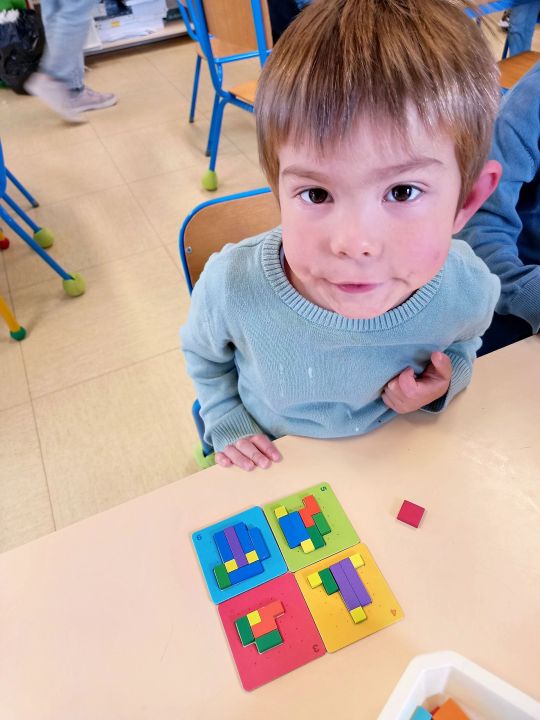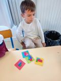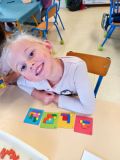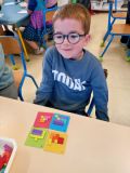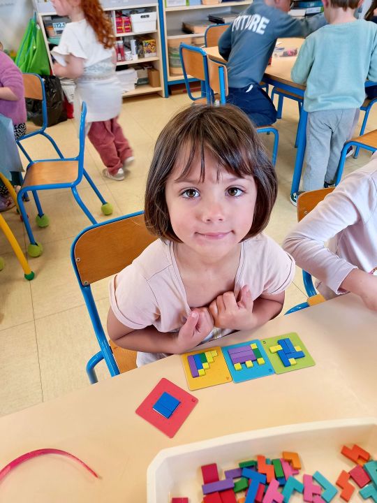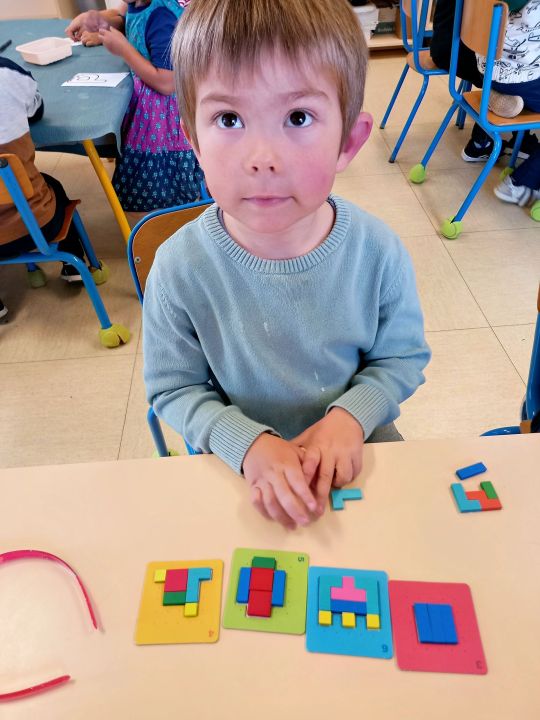 Les élèves de GS se sont initiés au pavage. Il leur a fallu résoudre des problèmes de choix des pièces et de leur orientation dans une forme imposée. Cet atelier a eu un franc succès !